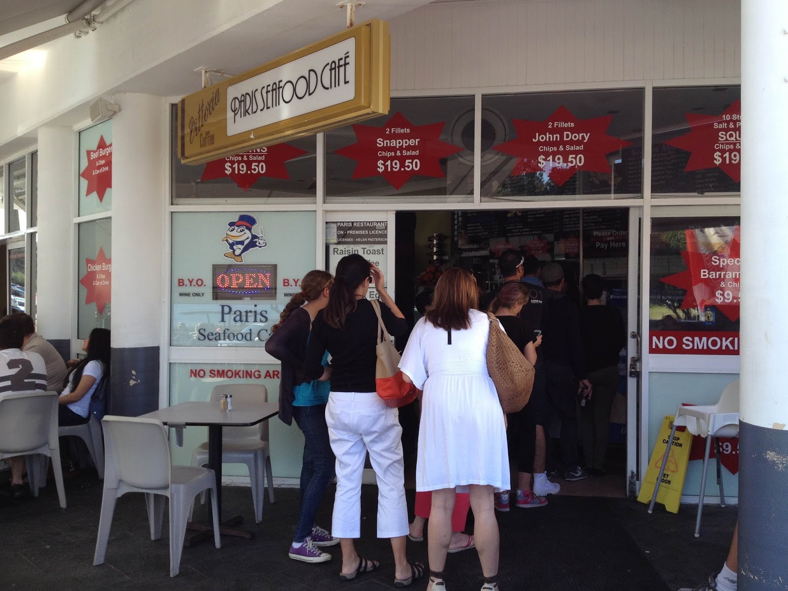 As well as the usual fish cocktails and battered fish fillets, the Paris Seafood Café offered a wide variety of fish including Snapper, Barramundi, John Dory and Basa – all of which could be cooked to your liking, grilled or deep-fried the traditional way. As you can see from the menu there were lots of other things that could be ordered aside from the traditional fish n’ chips. The oysters, chicken and lamb souvlaki and prawn cutlets sounded good, but today we were here for our good ol’ fish n’ chips feed. Among other menu items there was a seafood platter for two, as well as an all-day special of rump steak and chips for just $10.