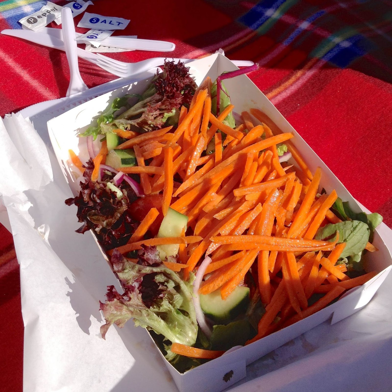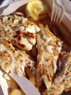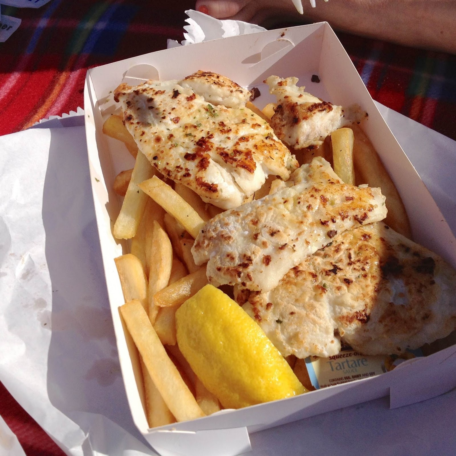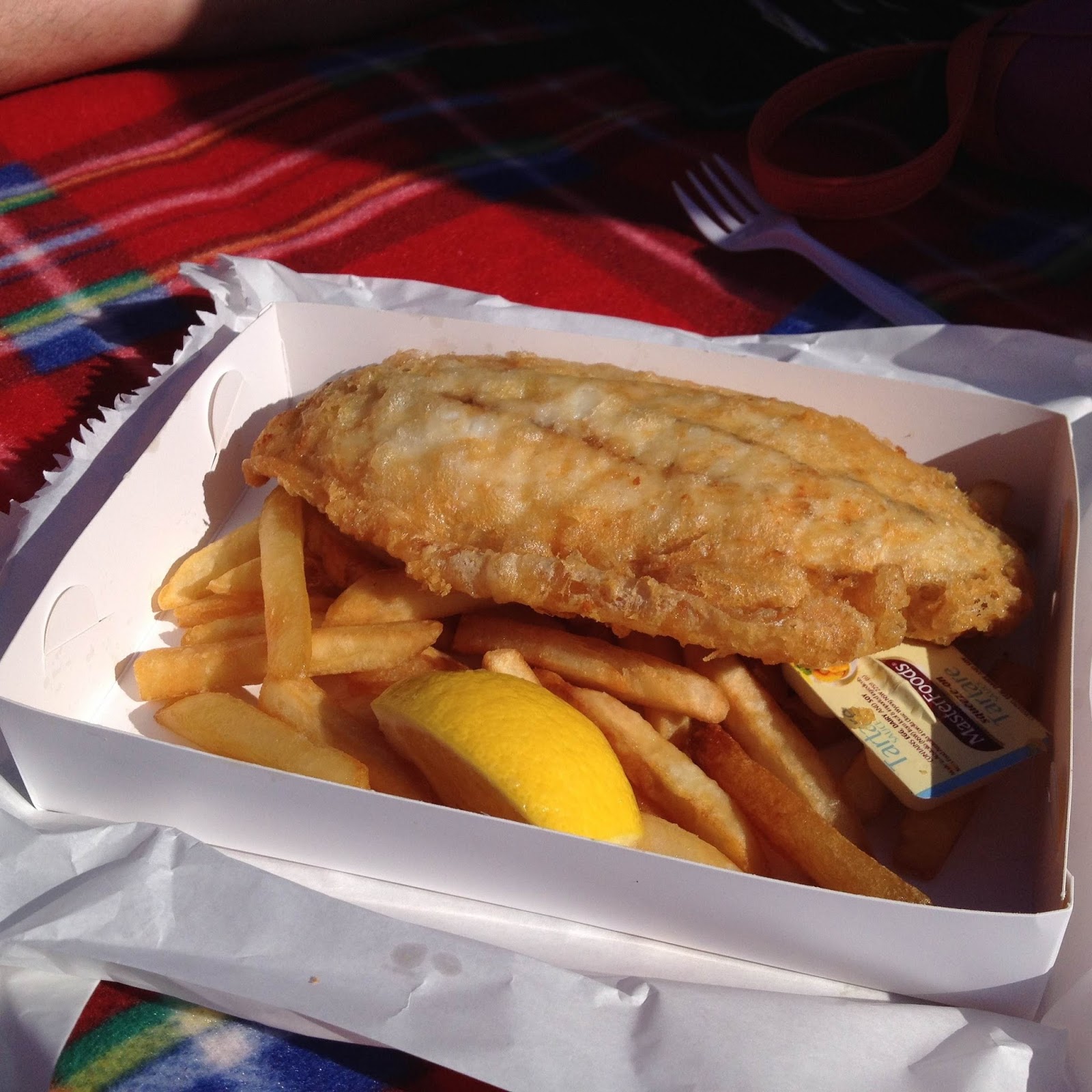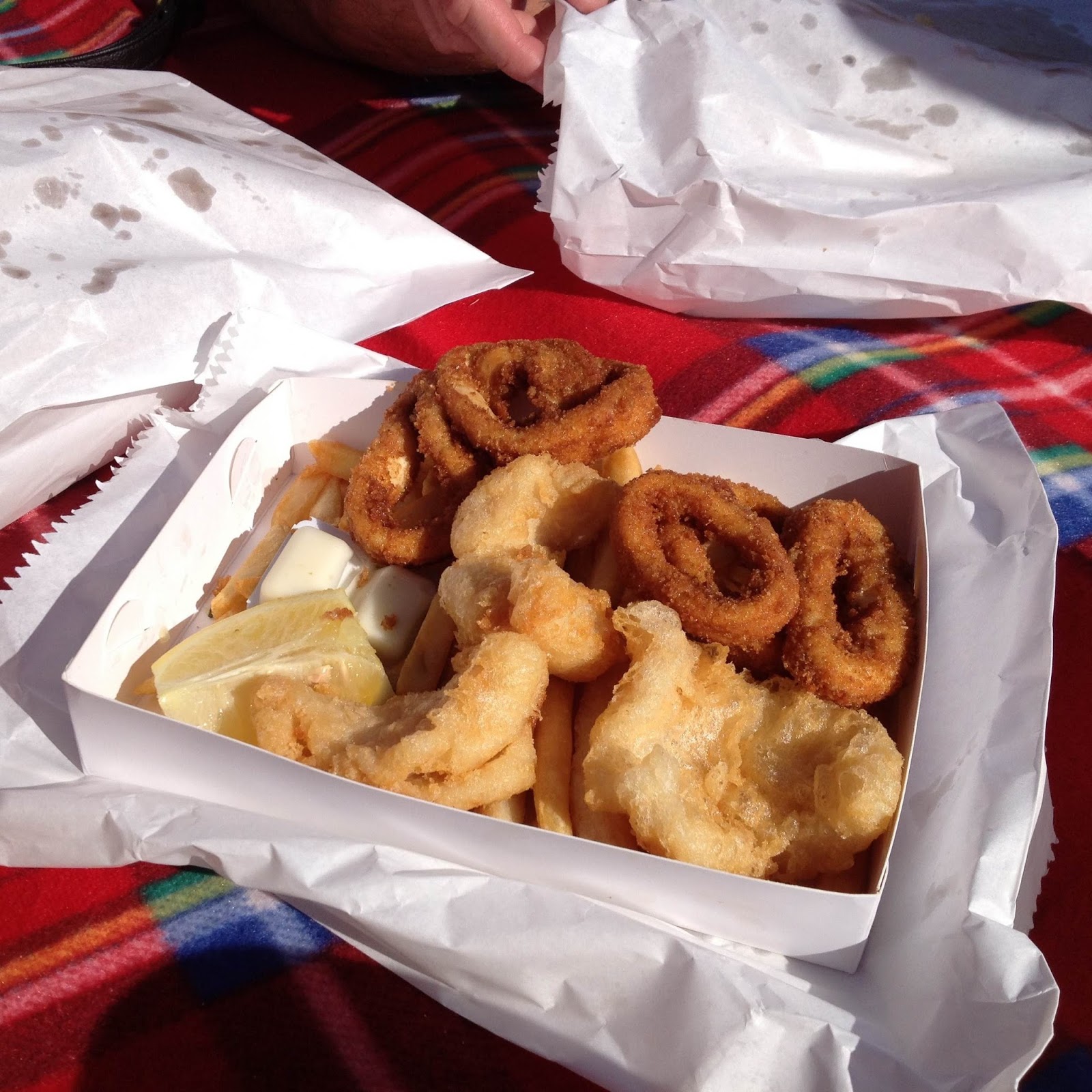 Our number was called and we carried our haul of boxes full of fish and chips over to the picnic spot we’d made to enjoy in the sunshine.
