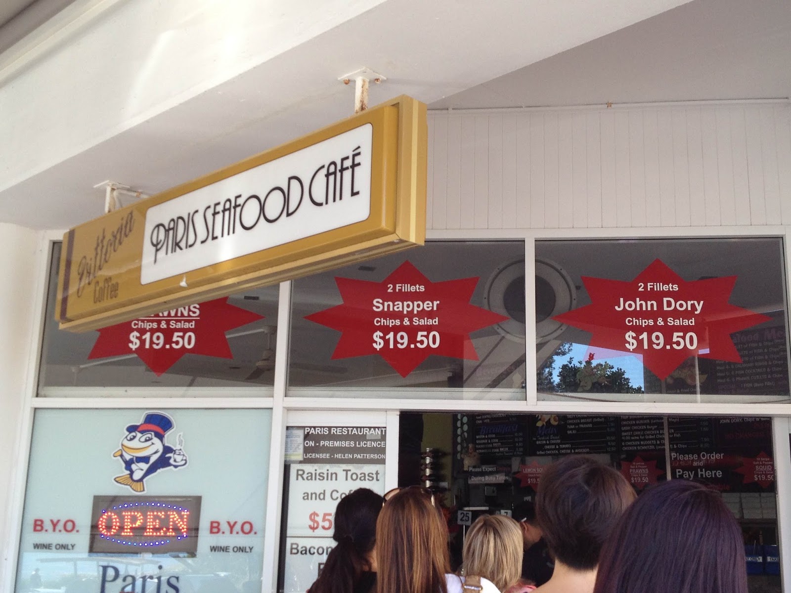 Paris Seafood Café has great views that stretch out across the park opposite which meanders down to a protected beach. We arrived just in time for the lunch rush hour – peak fish ‘n chip takeaway time. A bustling queue trailed out from the front counter down the path outside, and the alfresco eating area seemed to be buzzing, chock-o-block full of hungry Fathers-Day-Lunchers tucking into their crispy fish and salads.