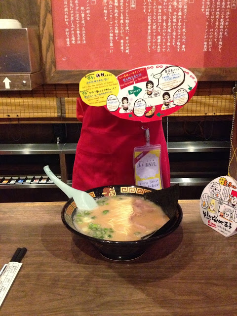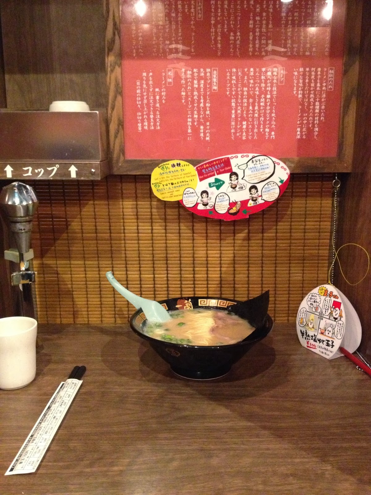 Then we joined another line, from which we could see a huge board full of blinking lights of all the seats in the eatery that blinked blue, red or yellow. Not quite sure what colour meant what but it was pretty cool to see. Then once seats were available we stepped inside and sat at a stool in our own little semi-sectioned off booth. It had its very own water dispenser and button to refill your ramen bowl, as well as a little bamboo ‘blind’ that was rolled down once your ramen was served.