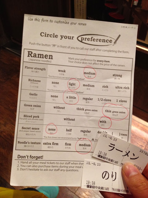 The fun part! Waiting for a seat we were handed a form that asked us our ramen preference based on flavour strength (weak – strong), richness (none – ultra rich), garlic, spring onion, pork slices, secret pepper sauce and noodle firmness. This was definitely something that got us excited about the ramen at Ichiran, and what was what made the ramen there so special. Each individual bowl is customised to it’s noodle-slurper’s preference, something that you can’t get anywhere else.