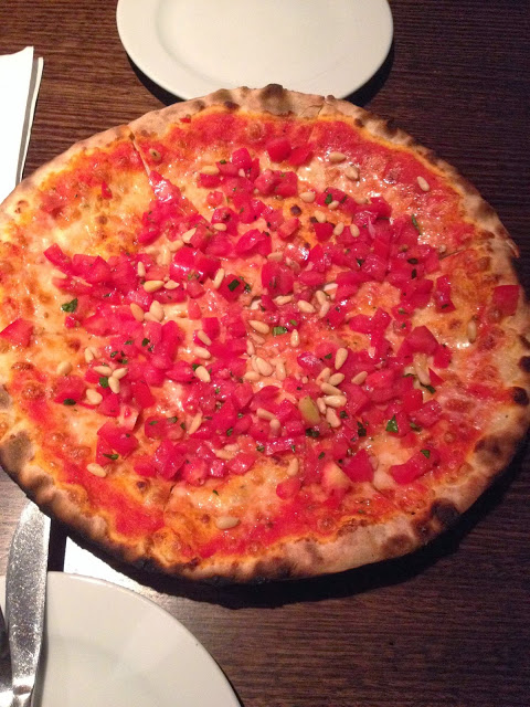 The pizza was the perfect combination of a traditional pizza and bruschetta, with the sweet tomatoes providing the perfect topping for a lovely light pizza. I really liked the pine nuts too, which added an extra crunch. The pizza dough was thin with a nice chewy, blistered crust.