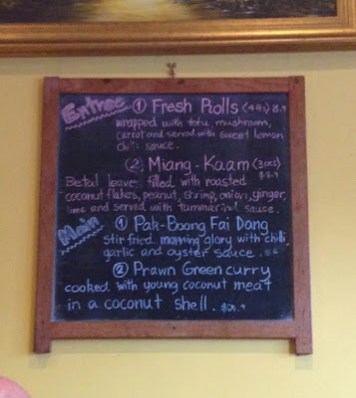 Although the shopfront is quiet and unassuming, once you step inside you are greeted with a warm and brightly coloured dining area decorated with numerous paintings and pictures of Thailand in an array of bright colours. We admired the beautifully hand-crafted crockery that was set down in front of us upon being seated, with the Buddha Raksa name and lovely blue patterns flourishing the plates. The specials menu on the wall indicated a number of entrees and mains, all of which sounded wonderfully pleasant.