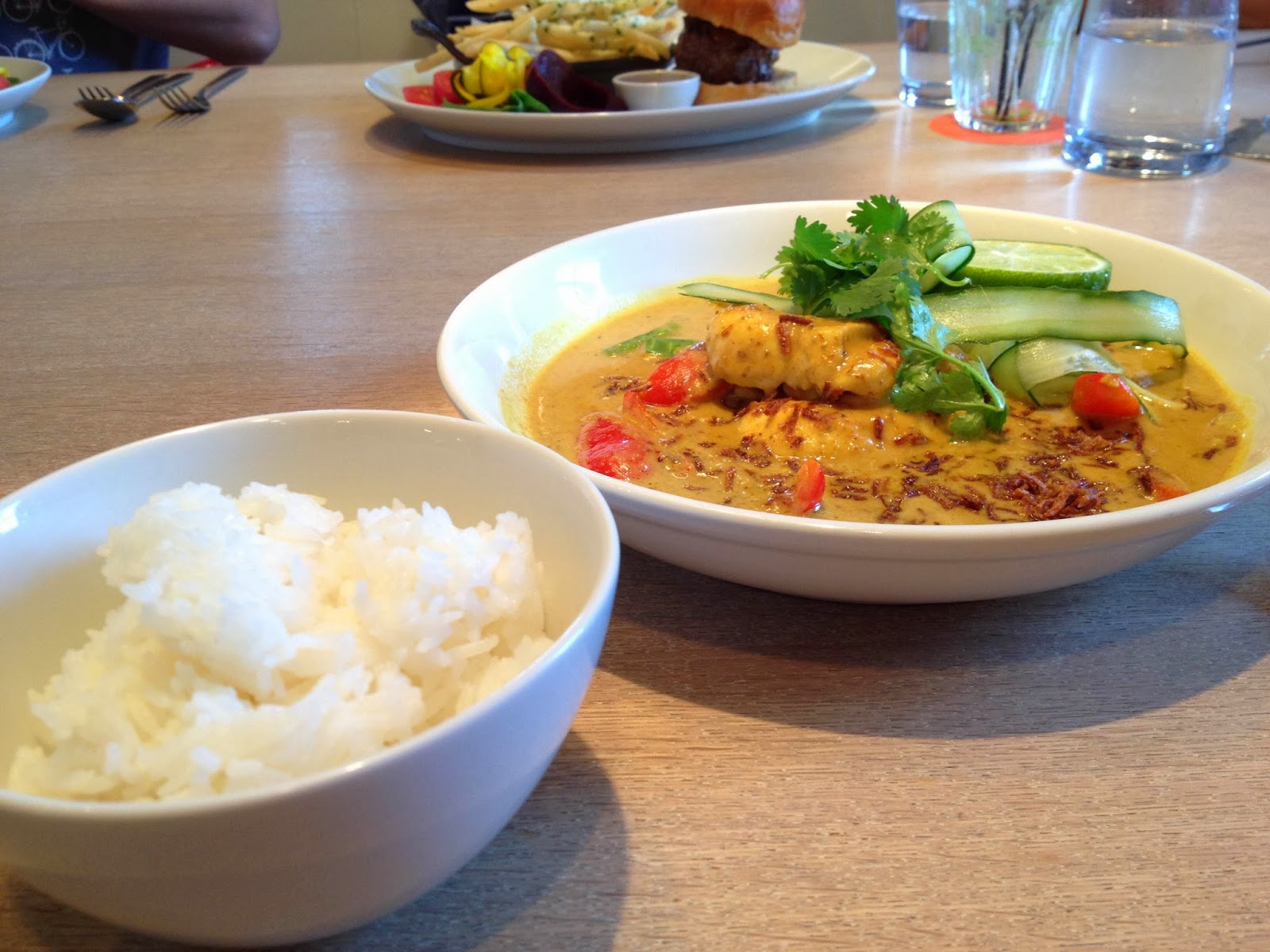 I had the fragrant fish and coconut curry, served with jasmine rice and cucumber relish. The curry was lovely and aromatic with a yellow, coconutty gravy that was sprinkled with golden fried shallots. The fish was perfectly tender, quite firm, and there were some snow peas and red capsicum in the curry, too. Thin ribbons of sour cucumber went perfectly to balance the rich, spicy curry.