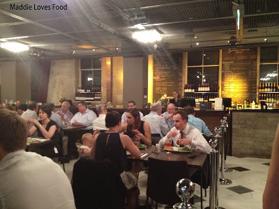 Along one side sits a long bar, mounted behind which is a large blackboard listing the menu and drinks. The far side of the restaurant is home to an open grill and kitchen behind glass which adds to the loud, noisy buzz of patrons.