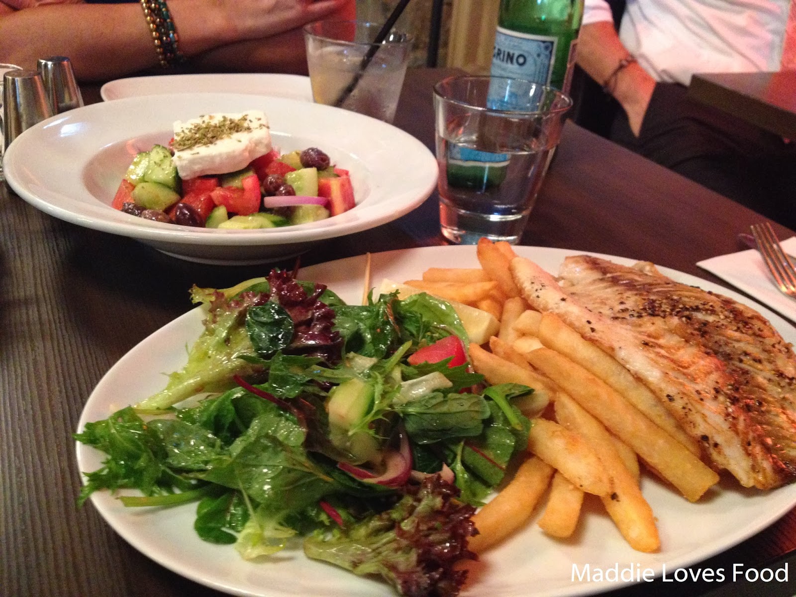 Greek Salad (main size $14.90) and Grilled Barramundi ($19.90)