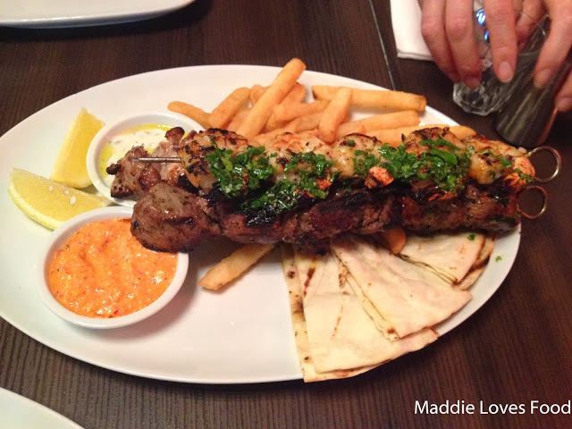 Mum shared the mixed grill plate with S, a mish-mash of prawns, chicken and marinated lamb pieces threaded onto metal skewers with a sprinkling of parsley and lemon, tzaziki and a capsicum dip on the side, called Tirokaferti. The dip was a creamy, orange mixture of roasted capsicums and feta, and provided a wonderful, garlicky accompaniment to the grilled meats. Garlic pita bread and chips came with it as well and the chunks of meat were flavoursome and tasty.