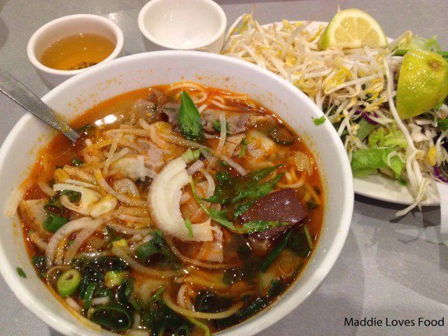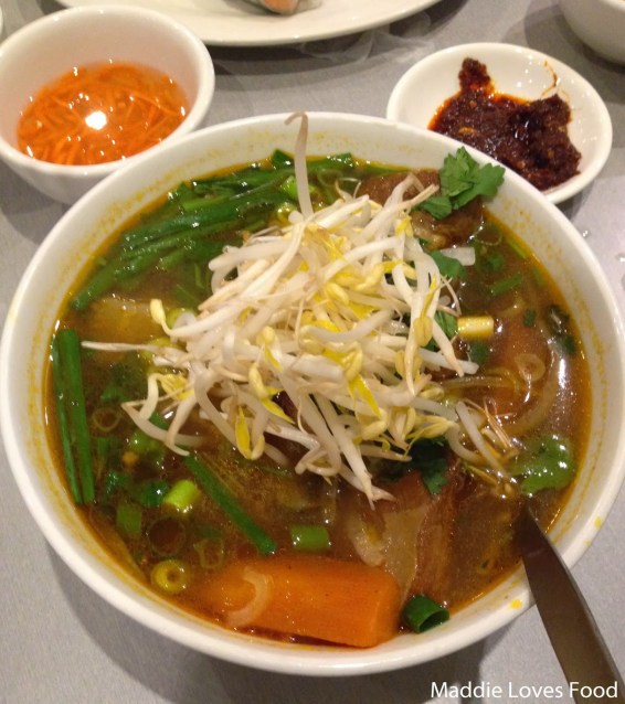 I had the Bo Kho, the beef stew noodle soup with egg noodles. This is one of my all time favourite noodle soups. My best description of it would be a Vietnamese beef casserole with noodles and a hint of tomato. It comes with slivers of onion, carrots, shallots, slow-cooked, mouth-melting hunks of tender beef brisket and gelatinous, slippery bits of tendon. My absolute favourite bit is the tendon, cooked to a jelly-like texture which carries the spiced broth like a match made in heaven.