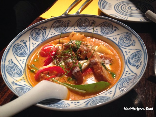 The red curry of roasted duck comes out first, glistening in an exotic blue serving bowl that holds bite-sized pieces of roast duck, holy basil, capsicum, snow peas, tiny red and green cherry tomatoes, lychee and pineapple. The addition of tropical fruit gave the curry a sweet burst and complemented the spiciness nicely. The holy basil was something I hadn’t experienced much of before, which added a slight anise flavour.