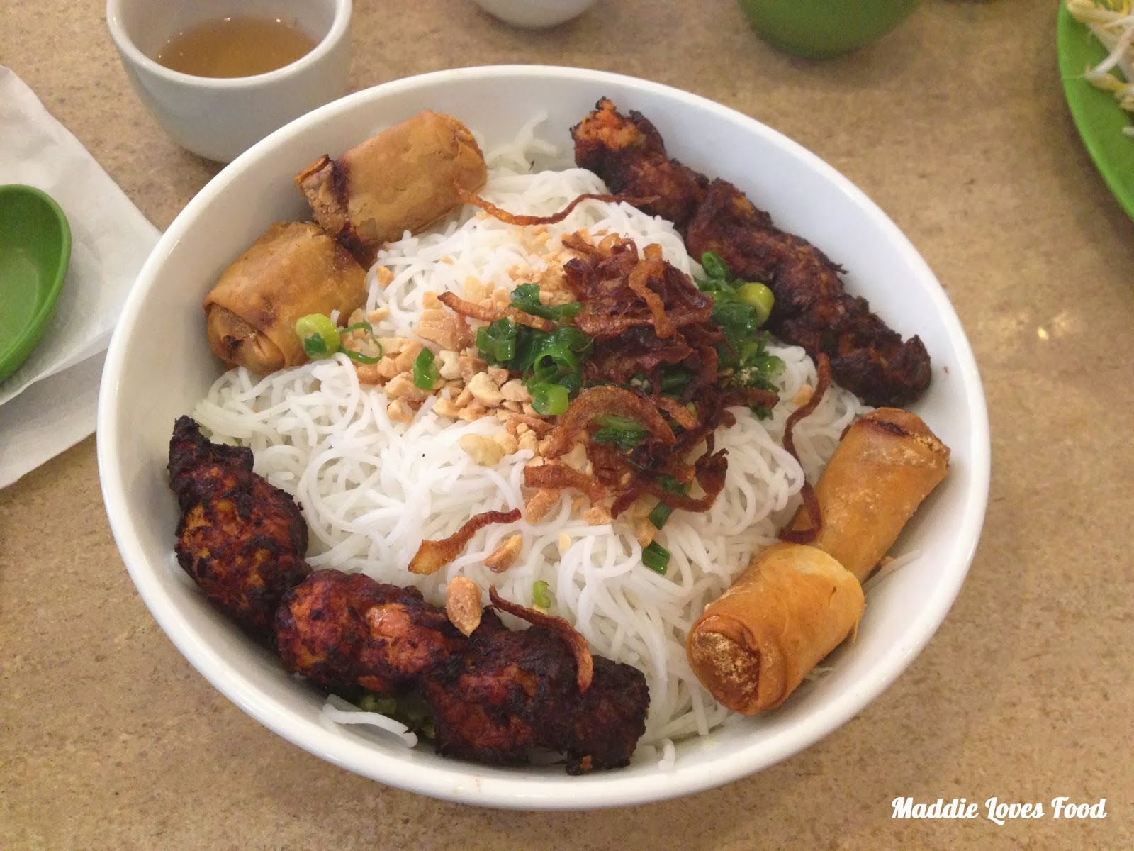 I had the grilled pork and spring roll vermicelli salad, which arrived sitting atop a colourful salad of shredded lettuce, carrot and bean sprouts amid a cluster of spring onion, crunchy fried shallots and what looked like to be chopped nuts (though it’s not very visible in the photo). The pork was just off the skewer, still in its grilled, compact form, and marinated to an orange tinge with a strong lemongrass flavour. The spring rolls were crispy and snipped to just a little bigger than bite sized.