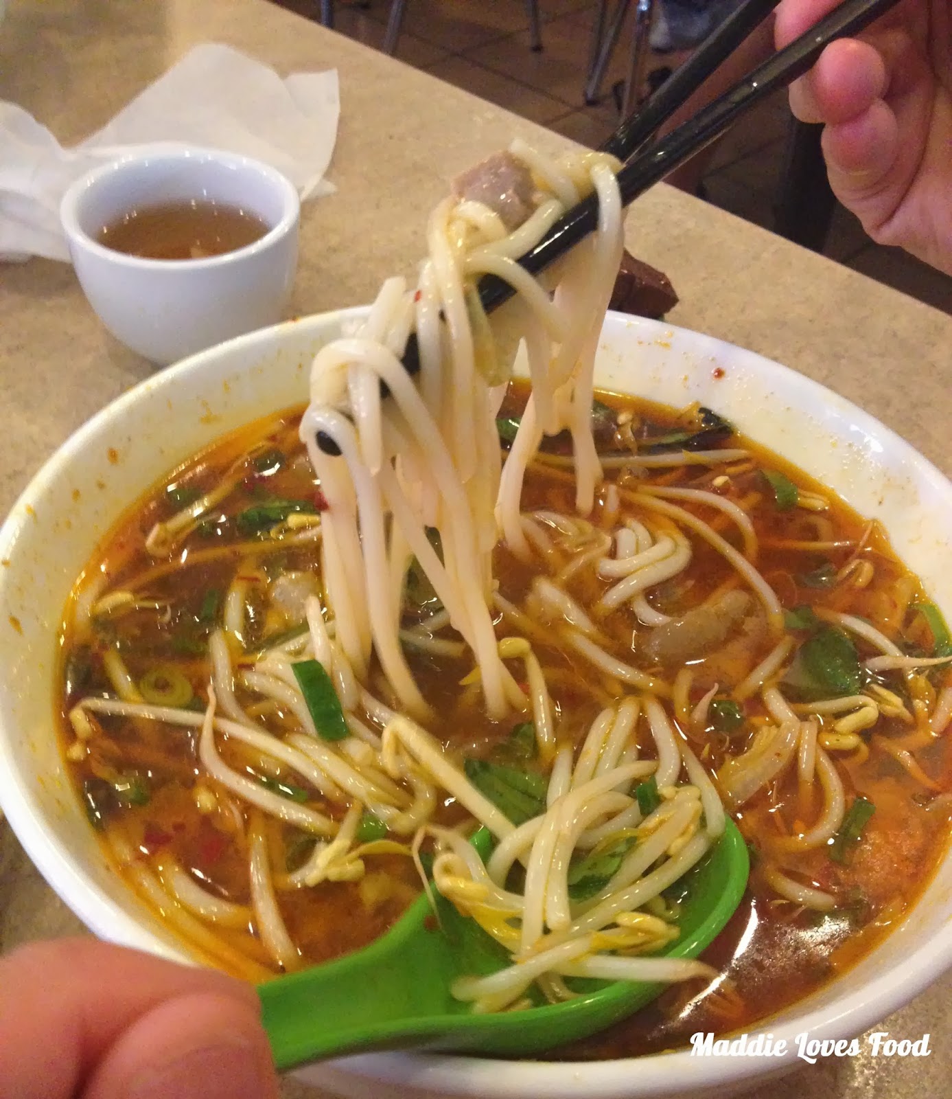 Dad gets the vermicelli spicy beef noodle soup, a somewhat kicked-up version of the traditional beef Pho. This comes with thick, tubey vermicelli noodles, a variety I hadn’t come across before, as well as a few blood jelly cubes. The broth has the same aromatic depth and flavour as the Pho, but with an extra added layer of bearable hotness.