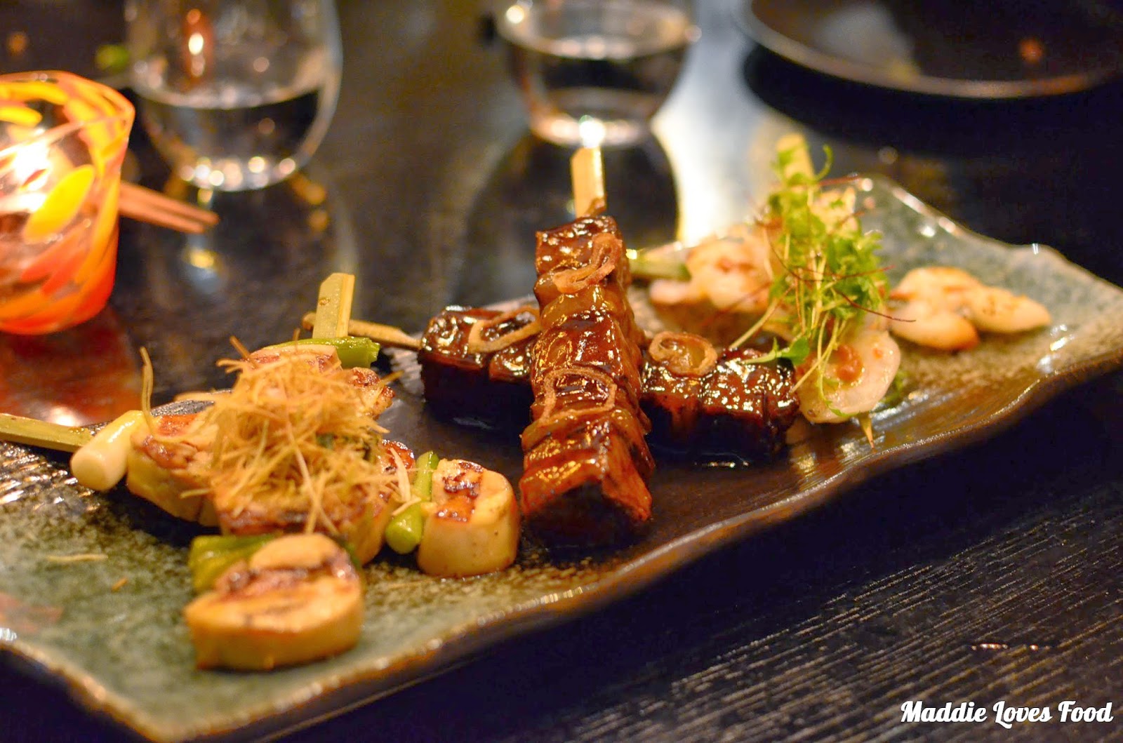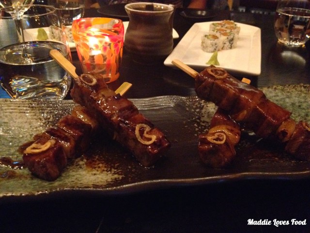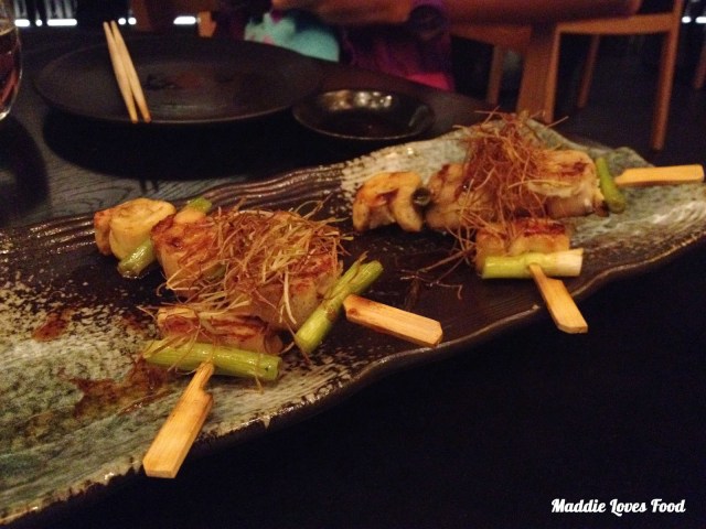 Next we had an assortment of Robata. By definition Robata refers to the Japanese method of cooking meat on skewers slowly over fire or charcoal, which gives it a deep, smoky flavour. We get the beef shortrib, chicken and prawn robata, which come two to a serve. The corn-fed chicken comes skewered between short sticks of shallot and leek and is tender and tasty drizzled in a yakitori jus, a cloud of what seems to be either finely shredded and crunchy shallot or other vegetable nested on top to garnish it off. The prawns are a little too spicy for us so Dad happily finishes them off, but the beef shortrib Robata is my favourite. The cut of meat means that it’s slightly fatty and without being too tough. the chunks of shortrib are wonderfully tender despite being big cubes of beef, smothered in a teriyaki sauce.