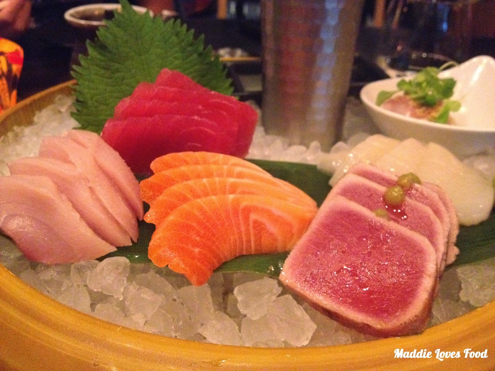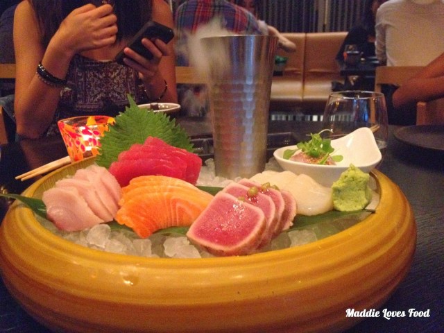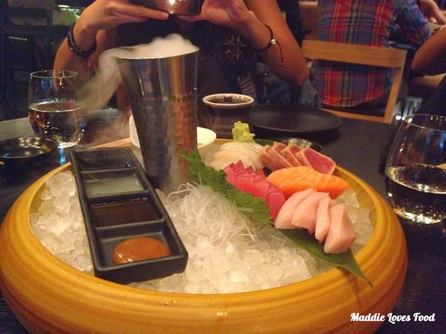 We decided to start off with the mixed sashimi platter, which came very grandly on an ice ‘bowl’ accompanied by a side-dish of condiments and a tall metal flask of dry ice, which added to it magnificence. I was in the bathroom when this came out, so when we got back we managed to convince the waitress to refill the dry ice, which she happily obliged to do.