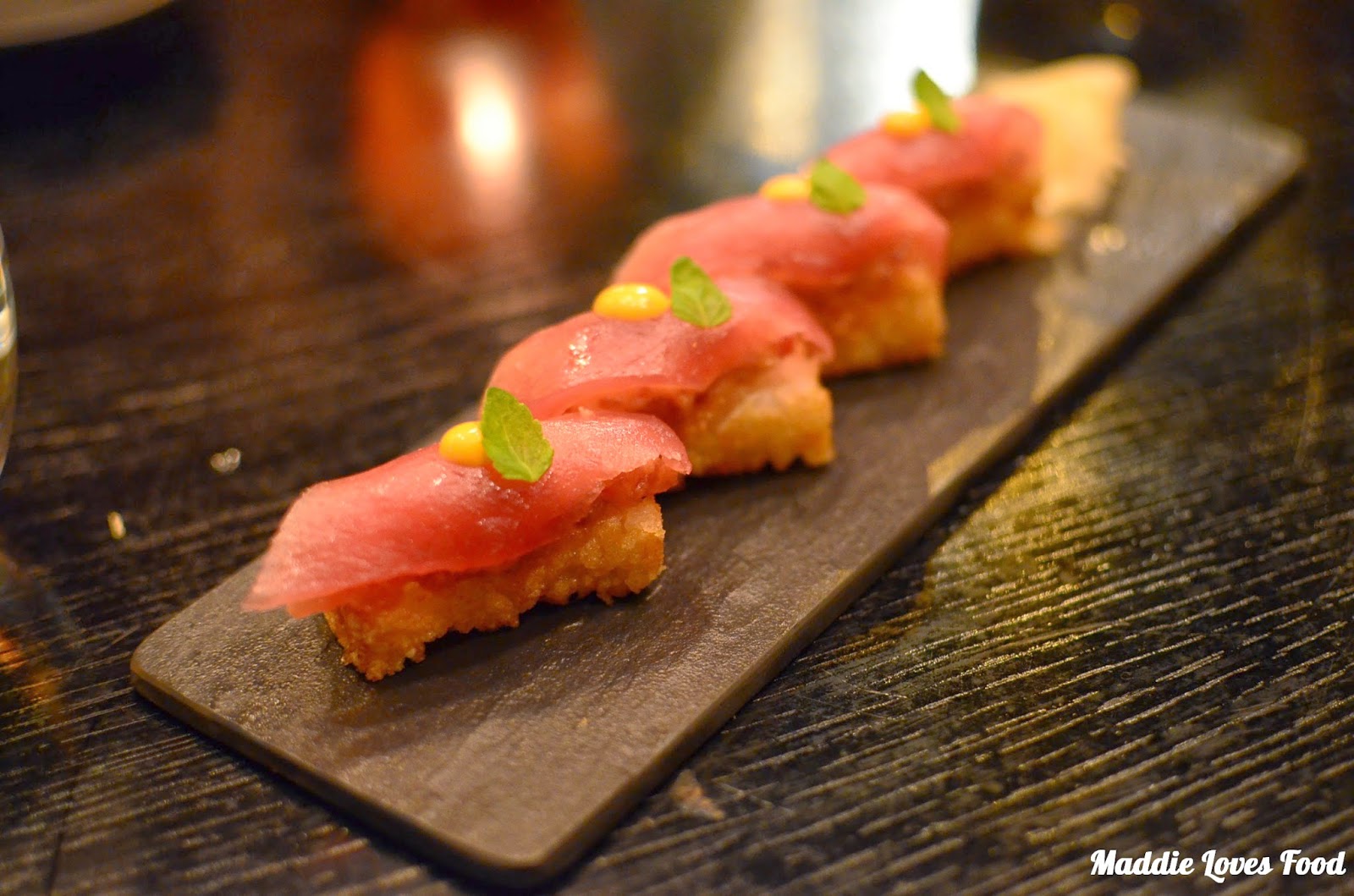 Bookings here are taken by phone or online, and is it often booked out a few weeks in advance with multiple sittings throughout the night. We’d made sure to book a couple of weeks before, with plenty of time to look forward to our dinner, this time to celebrate Mum and CK’s birthday. We’re seated in the middle of the room around a black table that has minimal decor and dim lighting, and are introduced to our waiter who helpfully lists the menu and asks if we have any questions. Service is extremely attentive and friendly, making the overall dining experience all the more pleasurable.
