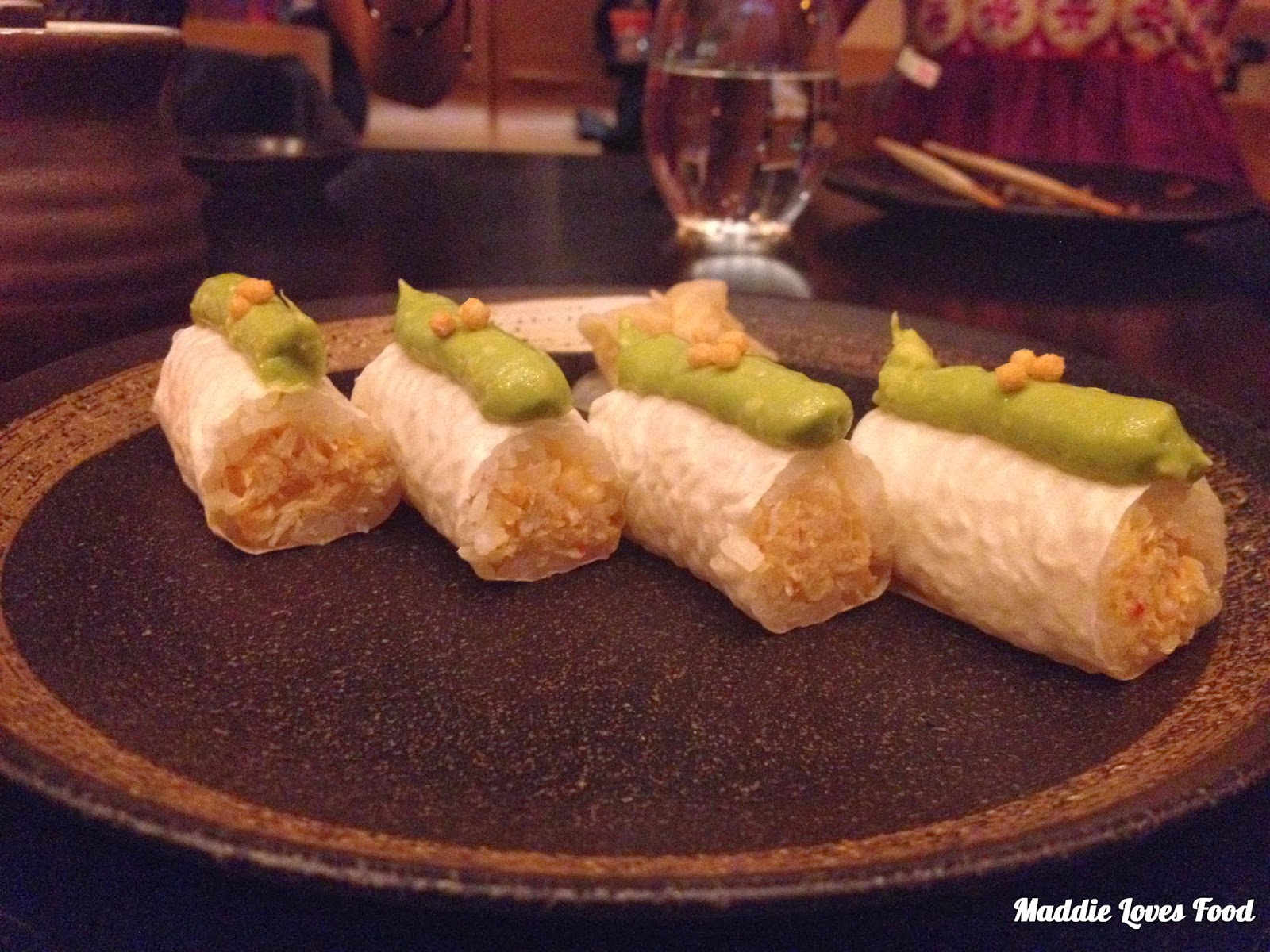 The Queensland sushi roll is pricey at just over $5 per piece, but it is is the epitome of Sokyo’s unique fusion cuisine. Rolled in thin pieces of soy paper are generous tubes of Queensland spanner crab which create a kind of lumpy surface on the opaque white paper, topped off with a long pipe piping of spicy avocado. The texture is unusual; not quite firm but rather more slippery and soft.