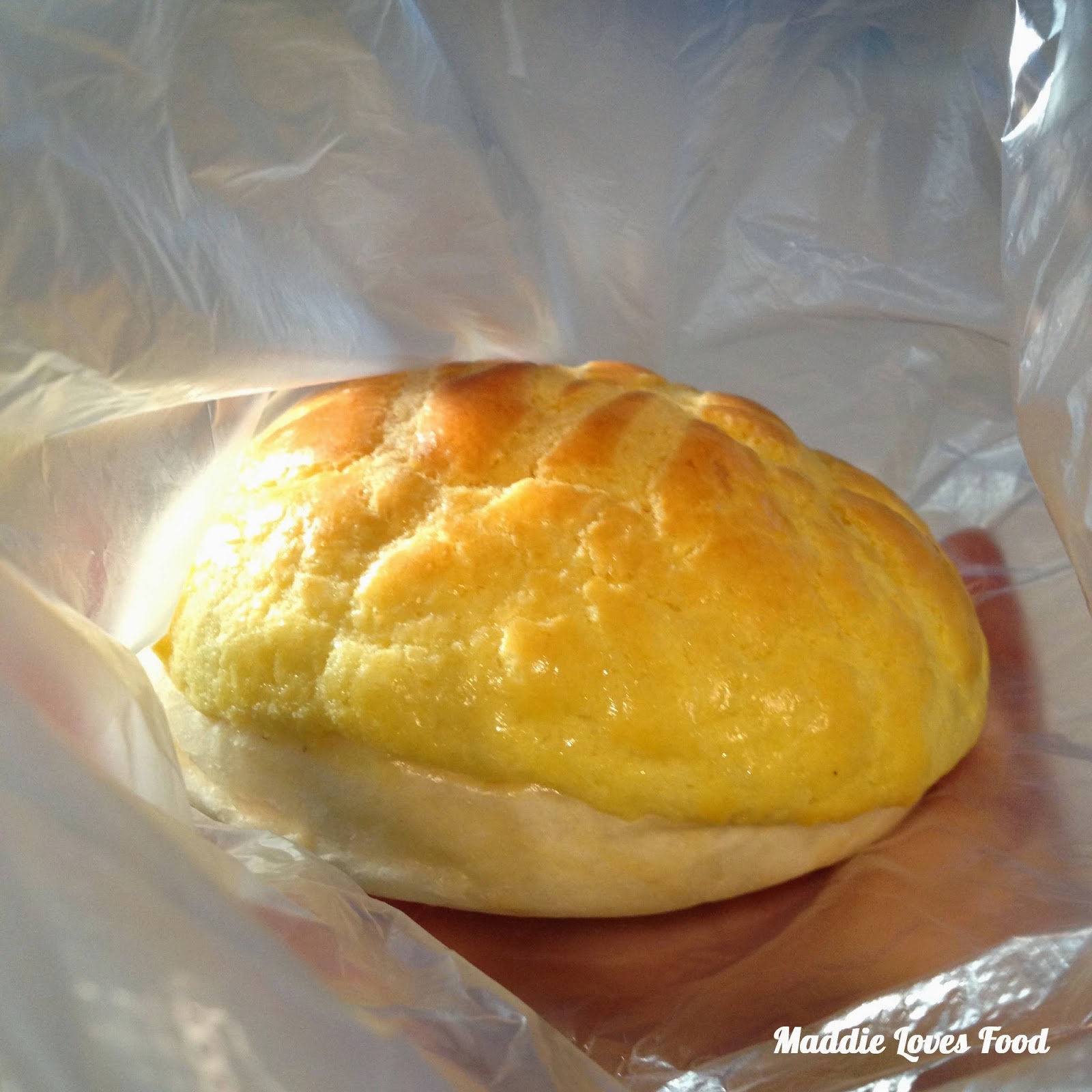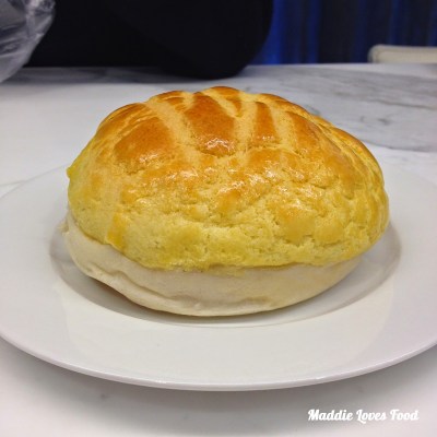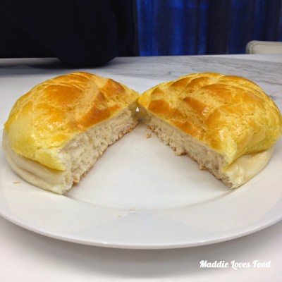 Oh, the Pineapple Bun. Sometimes it’s labelled ‘crispy bun’, or Bo Lo Bao in Cantonese. There’s no actual pineapple in here, but rather the name comes from the criss-cross pattern that is created in top of the bun once it’s baked, which resembles the outside of a pineapple. It’s created by a layer of sweet, eggy pastry placed on top of the sweet bread dough just before baking, which cracks and turns a golden colour in the oven. The sweetness of this bun varies with different bakeries, but the taste is just about the same – a sweet, soft bread  that has an extra layer of texture and flavour added by the extra layer of crumbly topping.