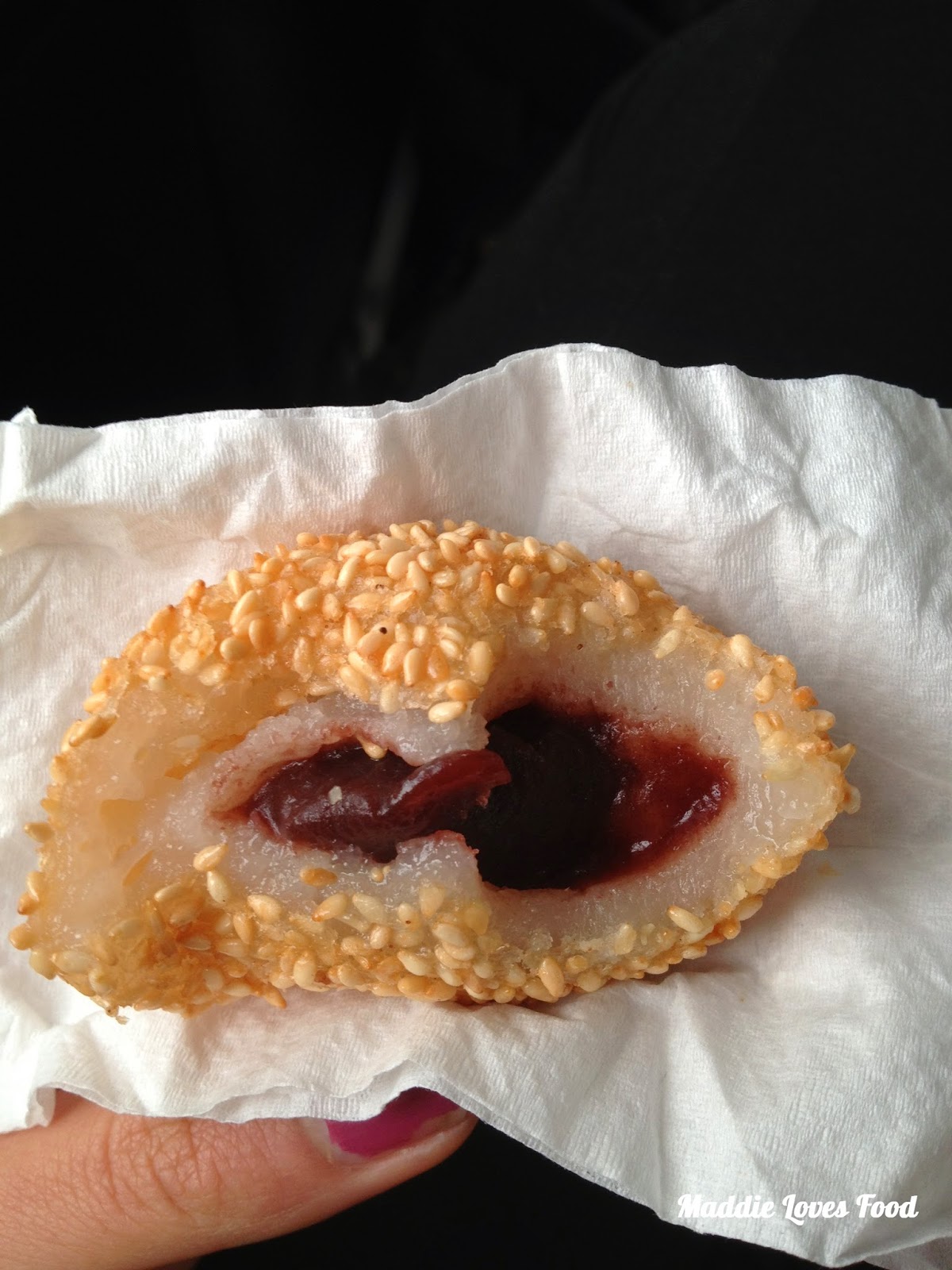 And my favourite: Jin Deui. These are little (or sometimes quite large) glutinous rice sesame balls, coated with sesame seeds and filled with a sweet red bean or lotus paste. Now, I used to hate red bean as a child growing up, and this was probably due to my exposure to red bean as a child being limited to the thick, gluggy red bean soups that were served at the end of a wedding or Chinese banquet. But in these little babies, red bean is my absolute, never-fail favourite filling of all time
