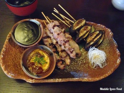 Chicken kushiyaki is tender and has a tasty charred flavour, dipped in a salty, sweet teriyaki sauce. We also order eggplant kushiyaki – rounds of baby aubergine take on a smoky char that come with a spicy version of the sauce. The eggplant is a not quite soft with a little bit of bite; the skin resists slightly that makes it hard to bite so you have to eat each piece in one mouthful.