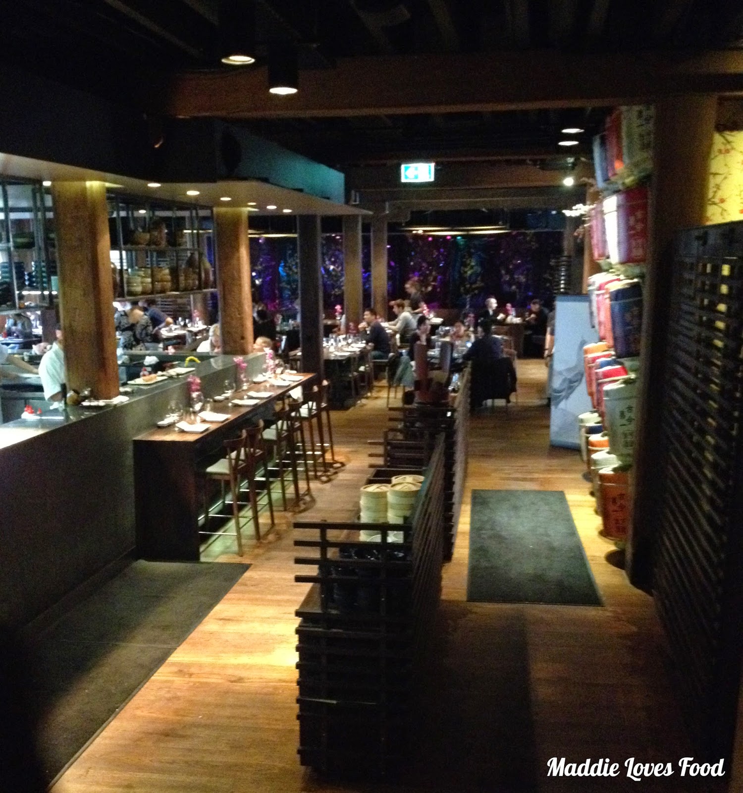 The dining area itself opens out down a small flight of stairs, just lower than ground level, and is unexpectedly large for seems like such a small area from the outside. Along the left is an open kitchen flanked by bar seating, with long rectangular and circle tables making up the central open space. Along one wall is a collection of dim, purple and blue-lit booths seating up to four people; along another are large tables, underneath these lies a surprise hole in which you can sit and dangle your legs into in traditional Japanese style.