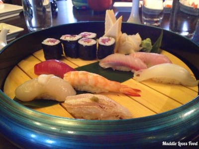 The sushi set is a chef’s selection of 10 pieces of nigiri, 6 mini classic rolls and tamago (sweet Japanese rolled egg omelet). On the platter come nigiri of tuna belly, salmon belly, scallop, prawn, kingfish, snapper, tuna and salmon. The mini rolls are tuna-filled and simply delightful, with a smear of wasabi. The nigiri are beautifully made, with the fresh pieces of fish sitting on top of delicate, almost circular mounds of rice, as opposed to the oblong shape we are used to.