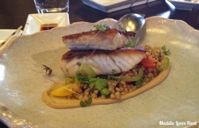 Two small fillets of pan-seared Cone Bay Ocean Baramundi are fried to a crunchy, golden crisp, topped with butter soy on a sweeter, ponzu-flavoured buckwheat and accompanied by a tomato salsa. The fish is sweet and the crispy skin is my favourite part; it is buttery and tasty and pure fishy deliciousness. The bed of buckwheat is lighter than the Wagyu buckwheat, fresher with the addition of tomatoes and a creamy, buttery golden sauce.