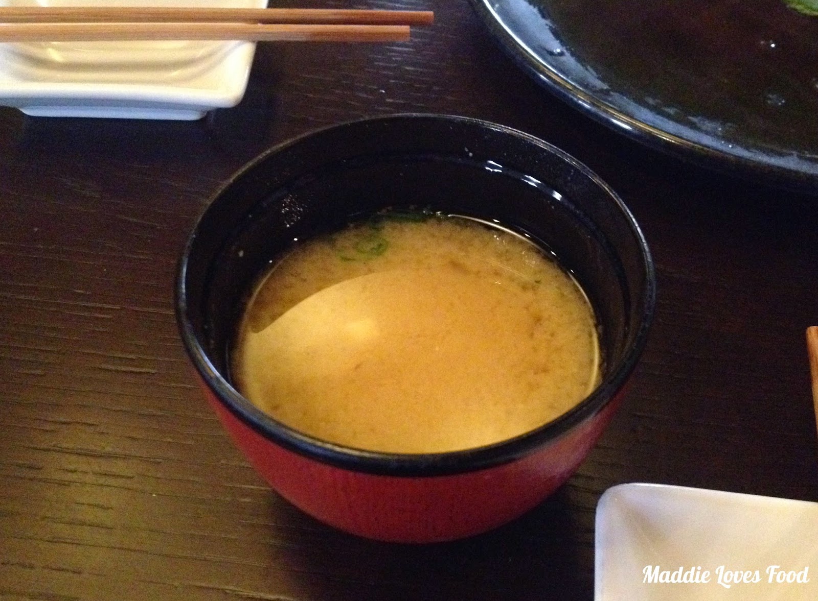 The first thing that arrives is our miso, one comes with the sushi set (see further down below) but we order two extra, as well as an extremely tempting scampi miso. The miso has a swirl of small cubes of tofu, spring onion and seaweed; with a taste that is only slightly more differentiable (ie. tastier) than the miso you would get in a less high-end Japanese restaurant. Or perhaps it’s more of a psychological feeling.