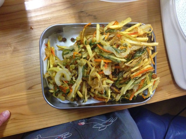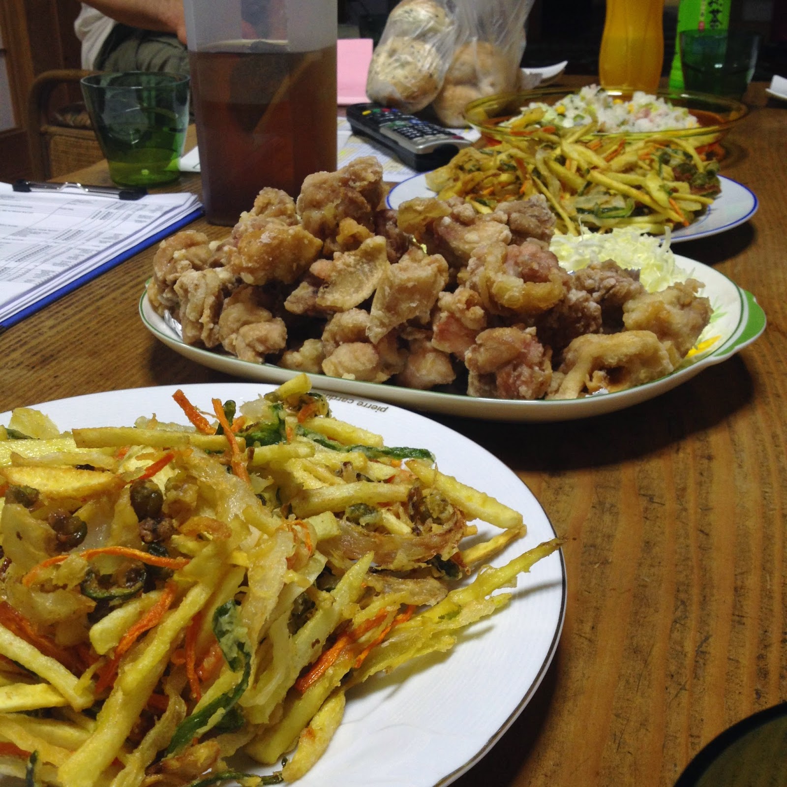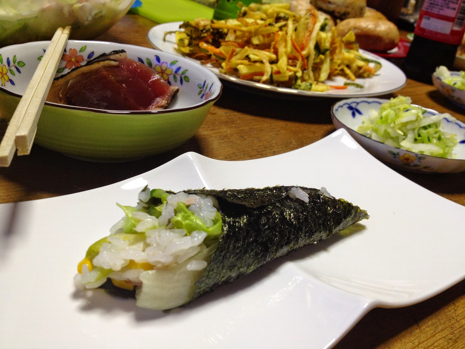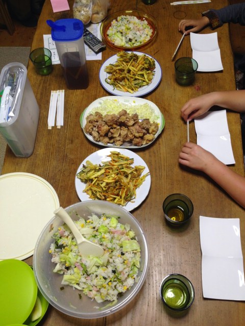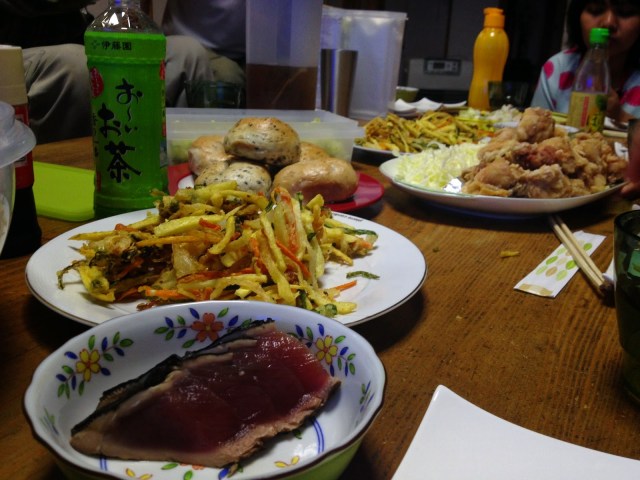 The island of Shikoku is famous for it’s seafood, in particular bonito. On the table there was also a tray of sashimi, darkened on the outside with a ring that bordered a ruby-red flesh. Only later did I realise that it was bonito that I’d eaten, fresh from the shop. If you can see behind that in the picture below, these sits a pile of bread. These were homemade bagels (yes, bagels!), made by our host father’s brother’s wife. They were wonderfully, joyfully chewy and soft, some were marbled with beady seeds that I loved.