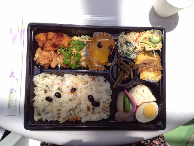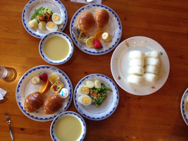 Breakfast the next day was laid out beautifully when we arrived, an assortment of little dishes that we were able to graze on and enjoy both together and separately. One was a warming, pale yellow sweet corn soup – yes, they do have sweet corn soup in Japan! – which was thick and wholesome. Sweet, salty cones of sheet white onigiri were arranged in rows; these were real onigiri, slightly warm in the centre and ever so sticky to the touch. A pair of shiny golden milk buns, which were a little too sweet for me, sat alongside bite-sized pieces of orange, banana (still in the peel!), strawberry and lemon. Spot the Kraft strawberry jam on the plate! Finally, a small dish of peppered cabbage, green pea and carrot salad, potatoes and a boiled egg. This was the trademark of Japanese breakfasts for me, perfectly prepared and presented. All these little dishes, though they didn’t look very big, were more than enough to fill me up for the rest of the morning.