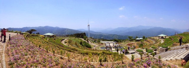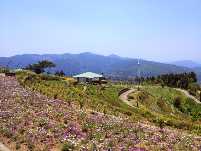 Upon arriving in Ōtoyo we travelled up a never-ending, impossibly narrow, steep and windy road that took us to Yutorist Park situated on the very top of a mountain; a ‘park in the sky’. Windmills dotted the park, landscaped with rows and rows of poppies of bright purple, pink and red that paved the way up a flight of stairs leading to a view of the whole park and all that lay below.