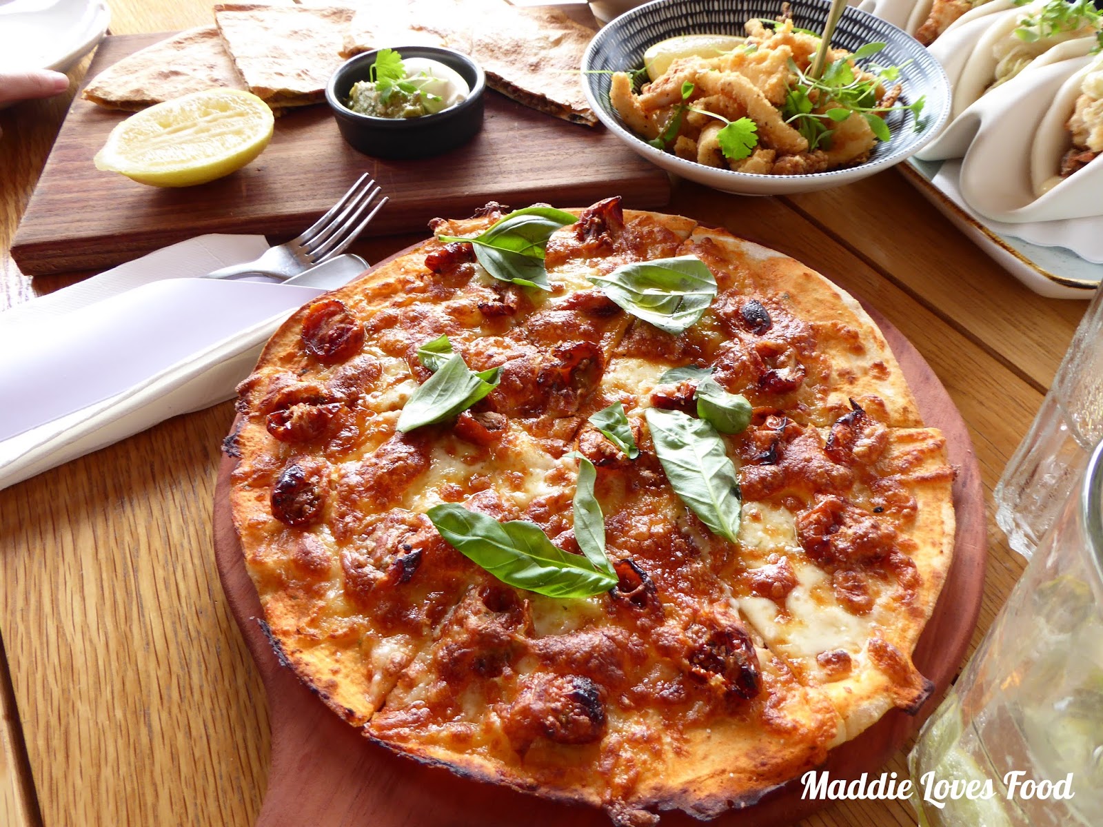 Margherita pizza has a thin base dotted with tomato halves, cooked to a golden crisp with bubbled cheese. Rather than the cherry tomatoes retaining their fresh flavour, they’ve shriveled to concentrated, charred bursts.