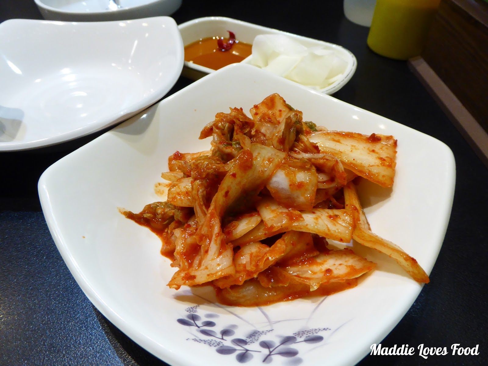 Central to Korean cuisine, banchan are complimentary side dishes which arrive after we order – spicy kimchi and pickled lengths of pure white daikon.