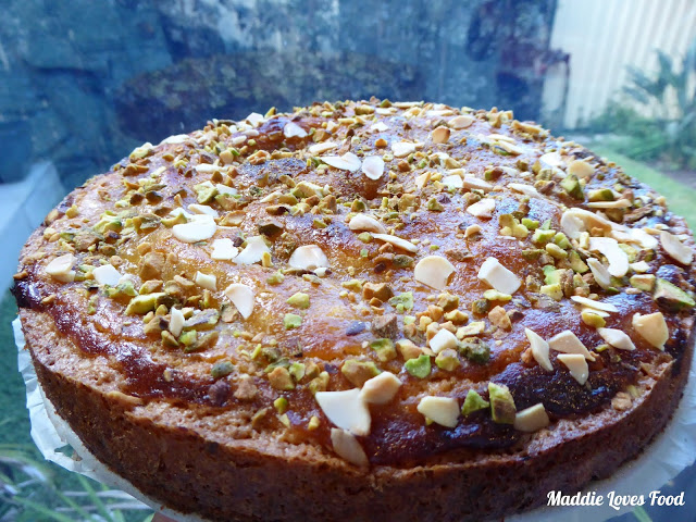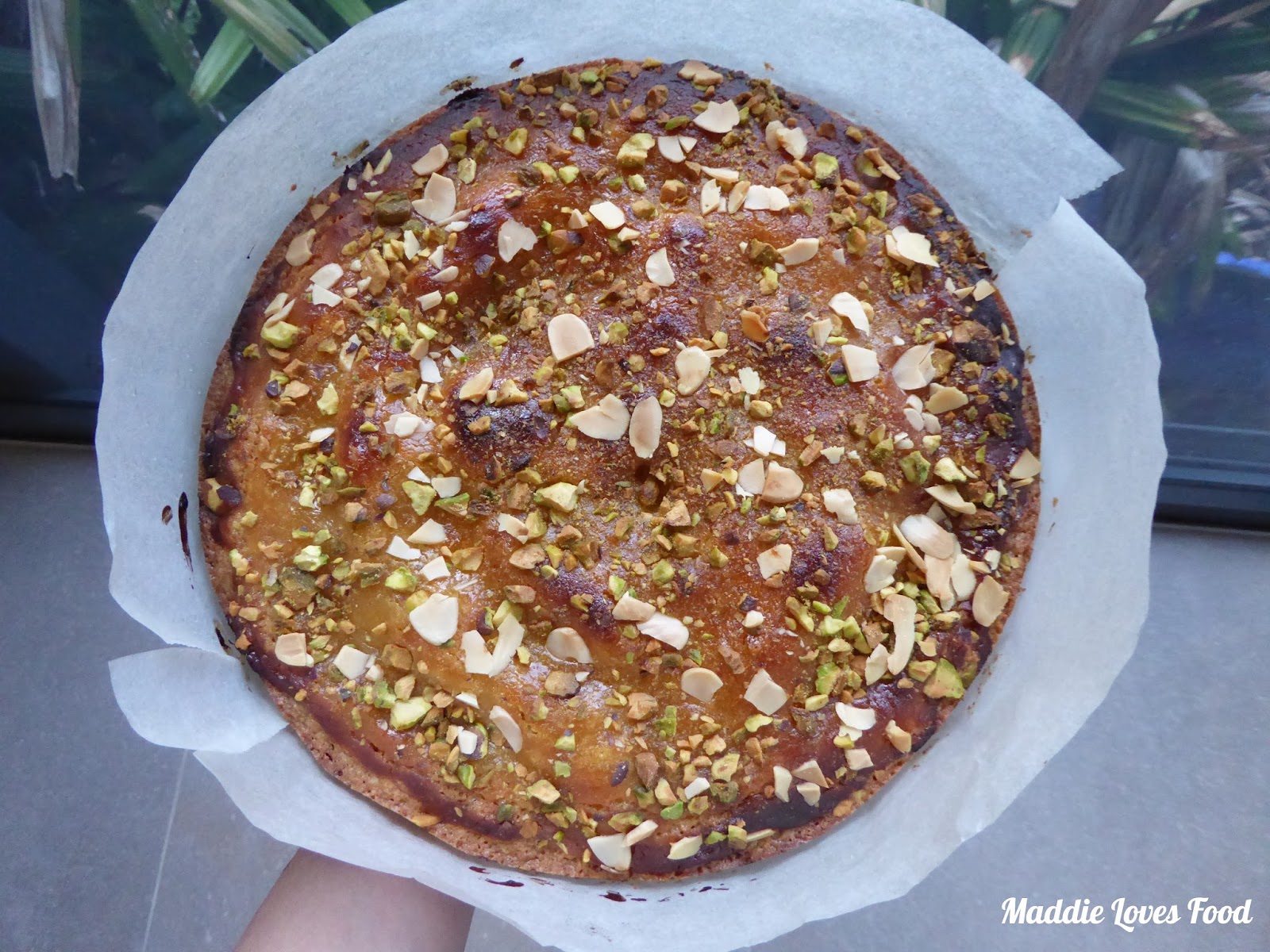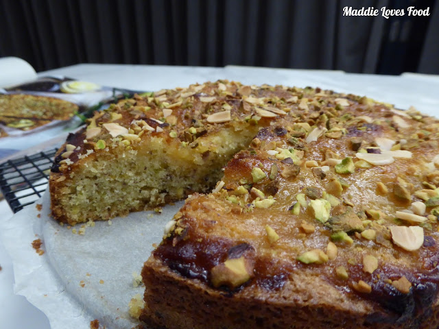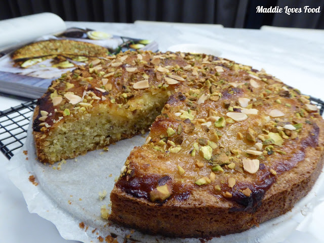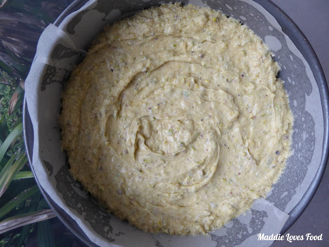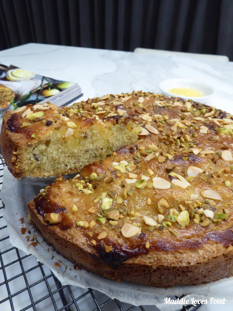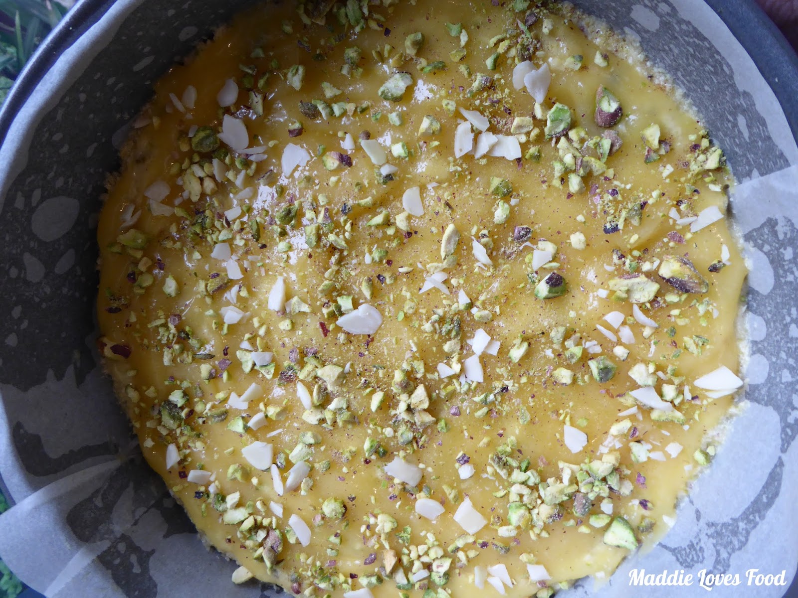 The cake batter uses finely chopped pistachios and only a small amount of flour to lend a slightly dense texture and nutty flavour, with a pop of freshness added by a small amount of lemon rind. Spread the velvety, sweet curd on top, sprinkle with more pistachio and flaked almonds and bake until the lovely aroma of citrus and nuts fills your kitchen.