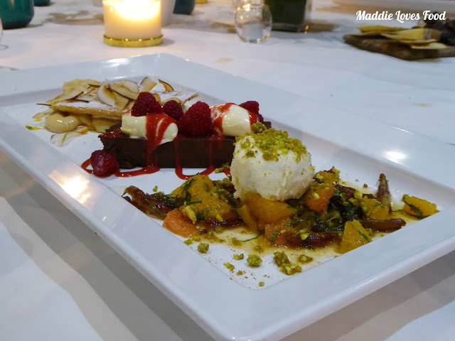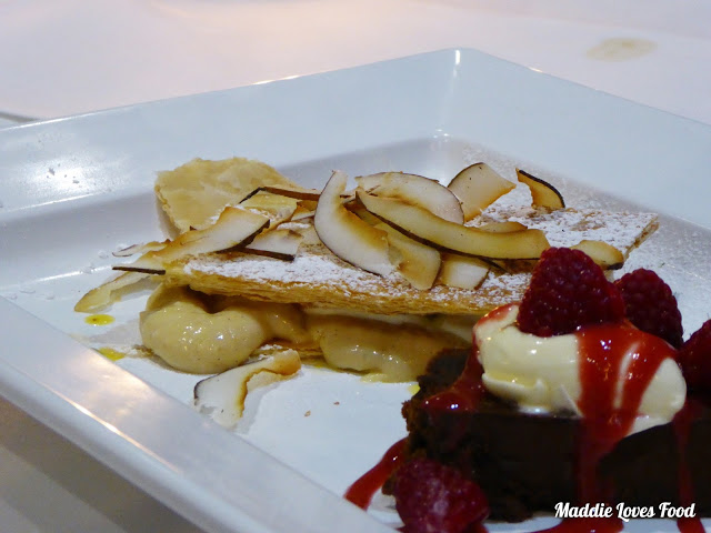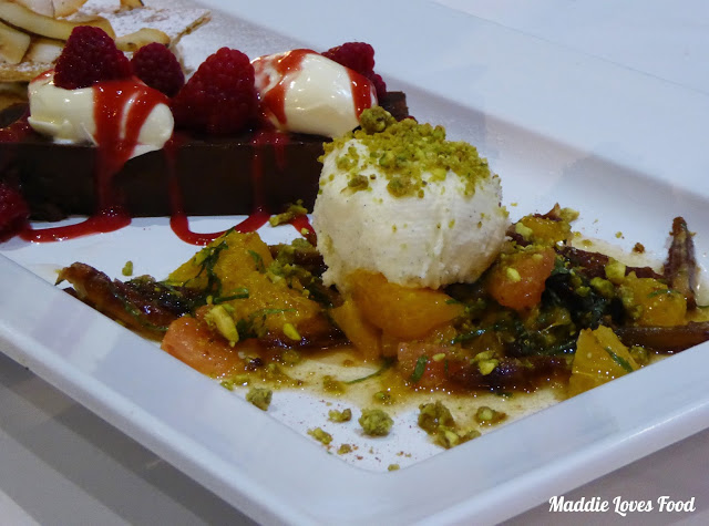 A slab of dark chocolate cake rests under quenelles of ice cream, raspberry sauce and fresh raspberries. This is a very rich dessert, with a texture that resembles cake rather than mousse. The raspberries help overcome the sweetness of this decadent dish, and although the champagne in the ice cream is not very noticeable, it has a deliciously creamy flavour.