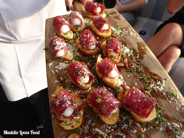 The ultra-thin Brik pastry cracks upon first bite, enveloping a soft pink pork jowl filling which makes for a perfect, tasty canape. The creamy aioli on top goes perfectly with the bite-sized mouthful.