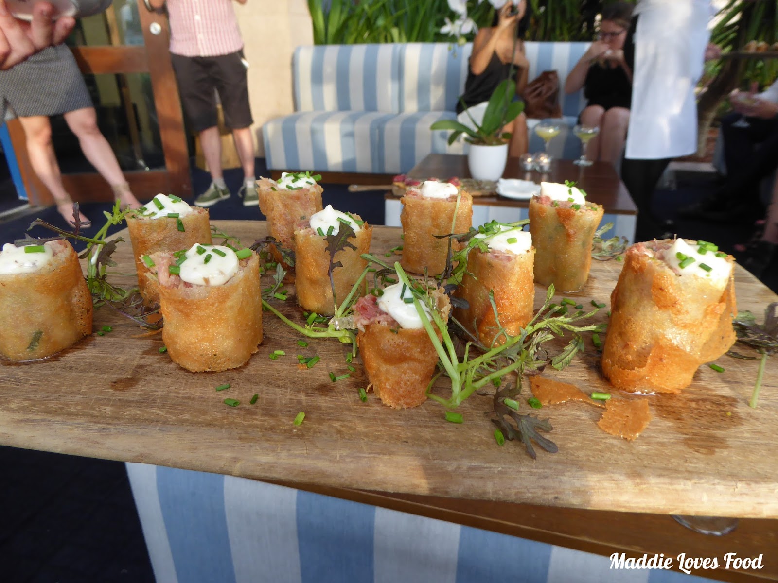 The ultra-thin Brik pastry cracks upon first bite, enveloping a soft pink pork jowl filling which makes for a perfect, tasty canape. The creamy aioli on top goes perfectly with the bite-sized mouthful.