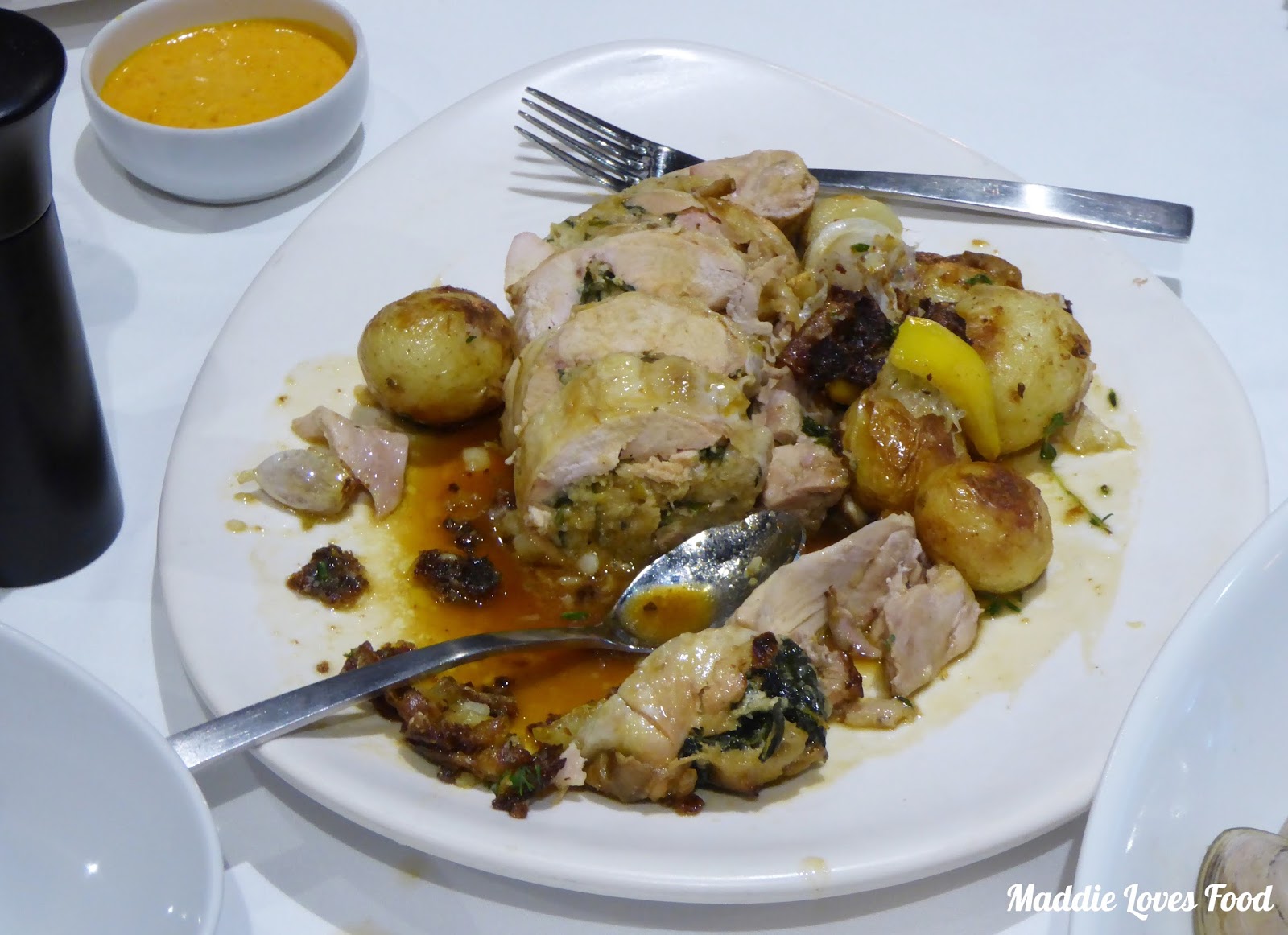 This roast chicken is flavoursome and moist from the breast right down to the bone. The lemony stuffing makes it even tastier, as do the nuggets of roasted garlic and rustic potatoes which soak up all the lovely juices.