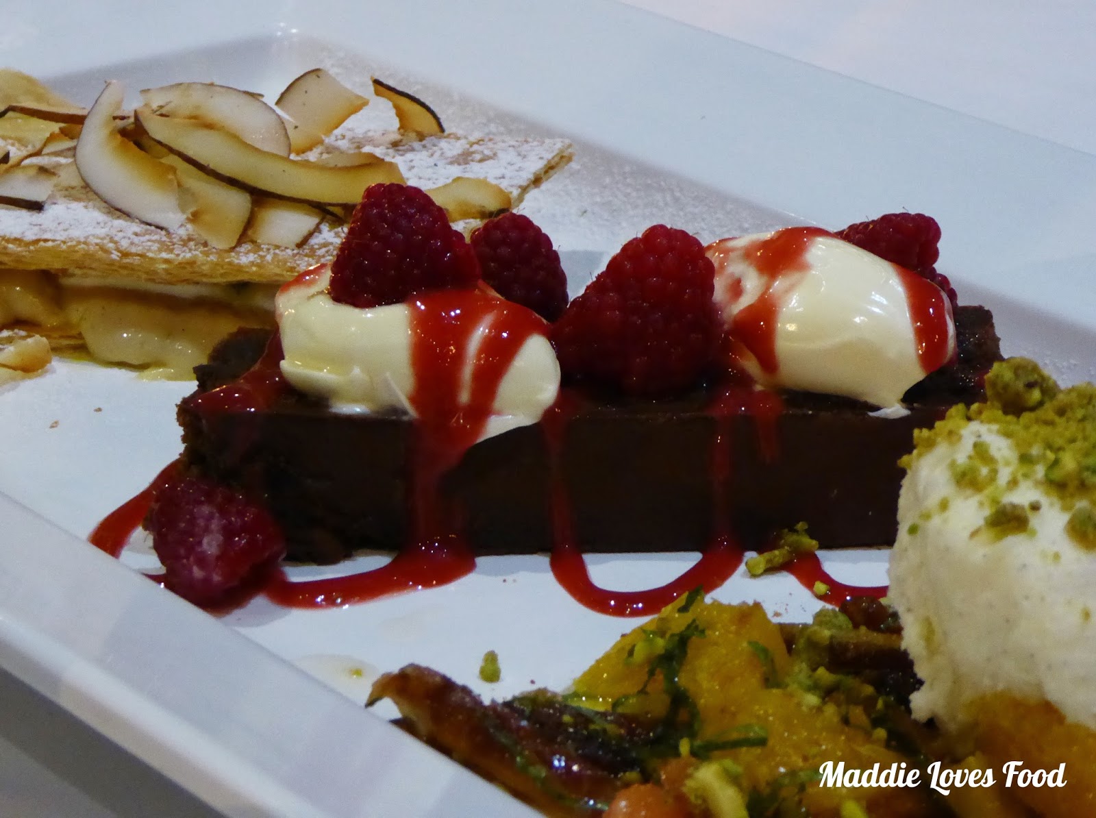 A slab of dark chocolate cake rests under quenelles of ice cream, raspberry sauce and fresh raspberries. This is a very rich dessert, with a texture that resembles cake rather than mousse. The raspberries help overcome the sweetness of this decadent dish, and although the champagne in the ice cream is not very noticeable, it has a deliciously creamy flavour.