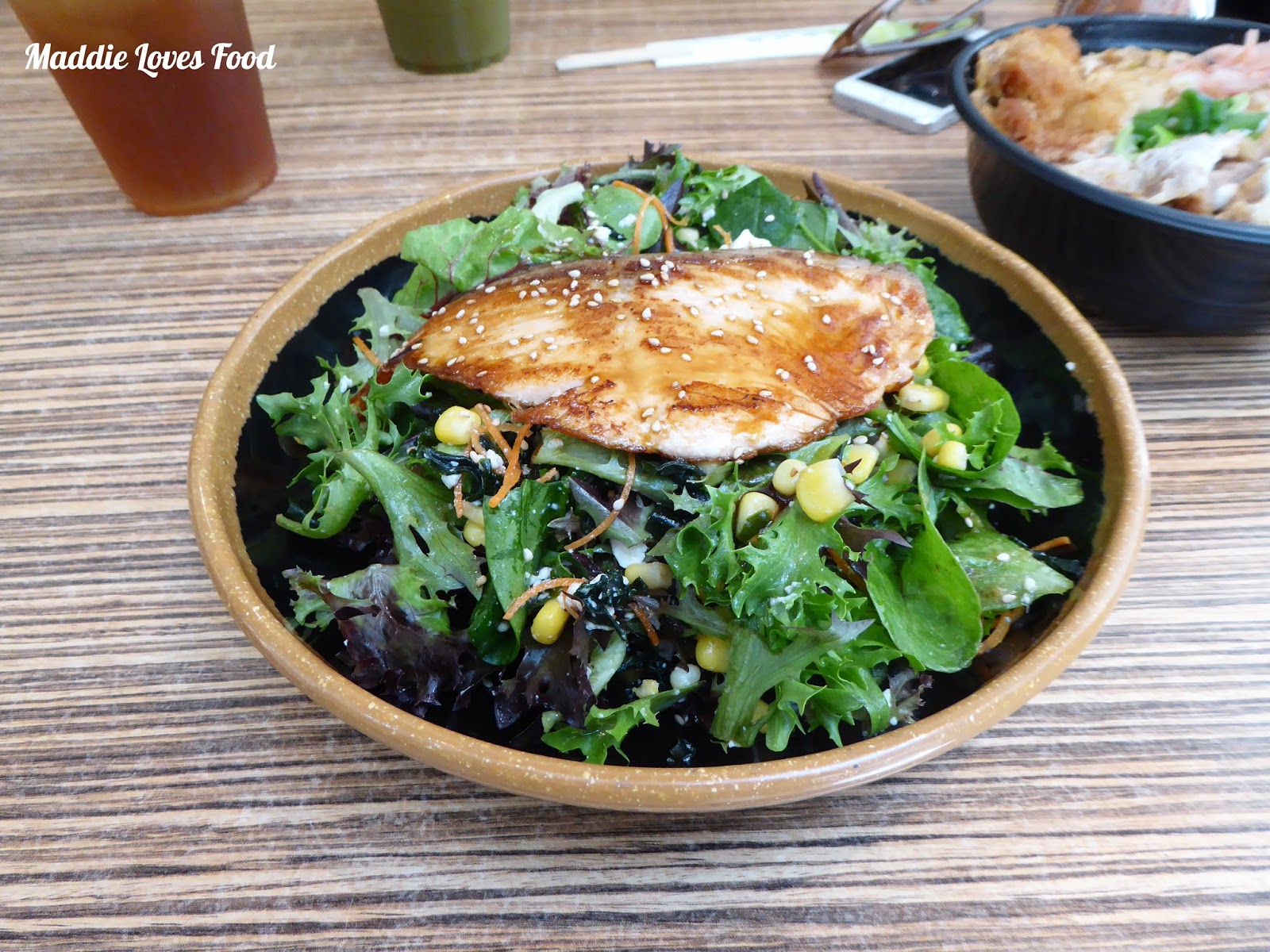 Teriyaki Salmon Salad with tofu, corn and seaweed ($9.90)