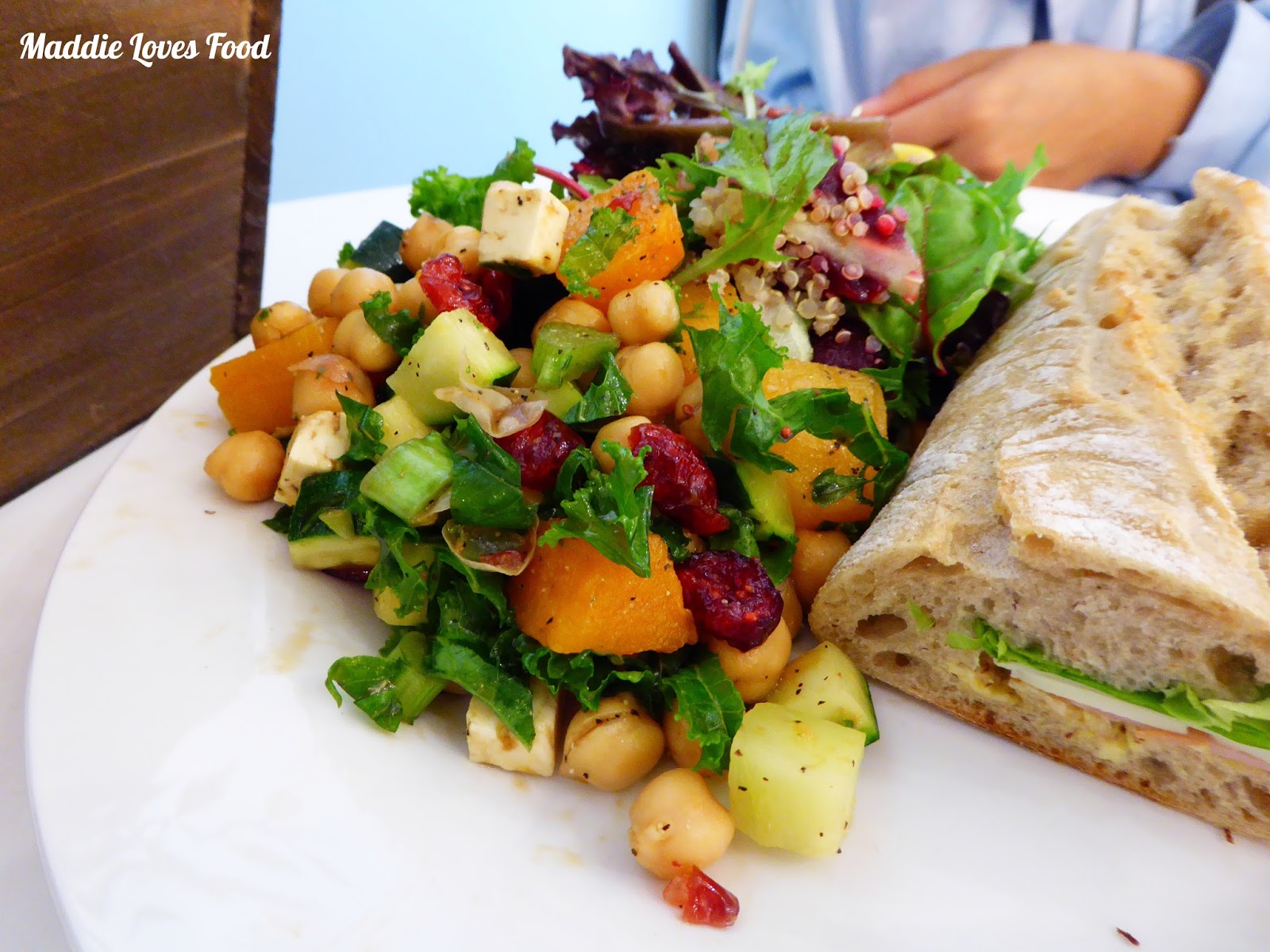 We’re told that one of the most popular lunch-time salads is this kale salad, dotted with feta, roast pumpkin, zucchini and chickpeas. Dried cranberries look like red rubies in the mix, and add a pop of tang and colour to each mouthful. There are also seasonal salads on rotation as well as the permanent offerings – when we visit the special is a fresh quinoa salad with beetroot, corn and cucumber.