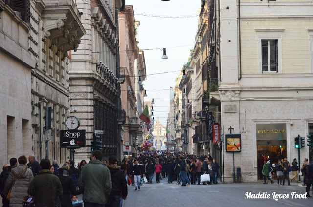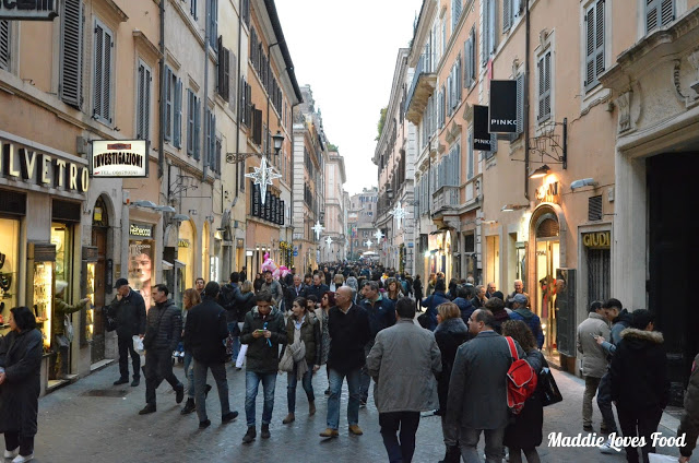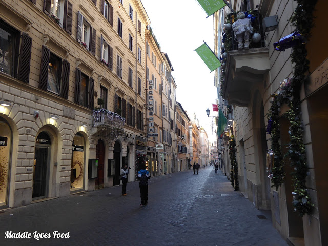 At 8am, upon stumbling tiredly out of Fiumicino airport into the crisp Winter air, our taxi dropped us off in the heart of the city on Via Del Corso, which is Rome’s main shopping strip. Most of the shops don’t open until around 10am, so we thought we’d start our day the Italian way – with an espresso and breakfast pastry. Many Italians have this standing at the café counter in the morning, rather than sitting down at a table, as it’s a much faster, cheaper way to have a caffeine fix without paying for the extra table service.
