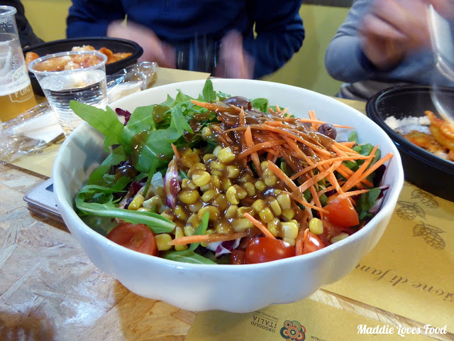 Compared to other salads we had while in Italy, this was one of the best. Rather than served as a mix of limp salad leaves, this is a generous tumble of rocket, radicchio, carrot, cherry tomatoes and corn. It’s topped with a thick, glossy deep brown dressing.