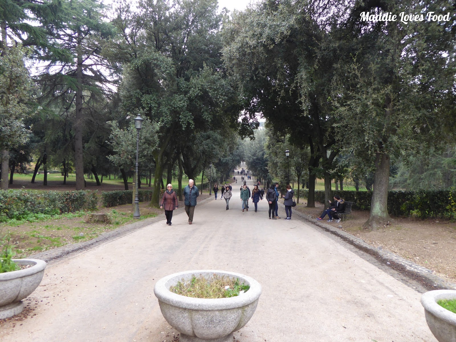 A wide, white gravel path runs down from the front of the Borghese through the Villa Borghese which takes you to the other side; from there we took a bus back to Via del Corso and walked to Piazza Navona.