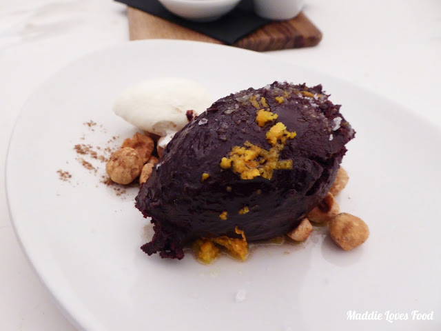 Baked chocolate ganache, spicy hazelnuts, orange oil (£9)
