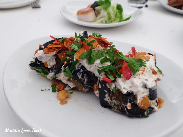 Roast aubergine, almond yoghurt, spiced almond flakes (£8.90)