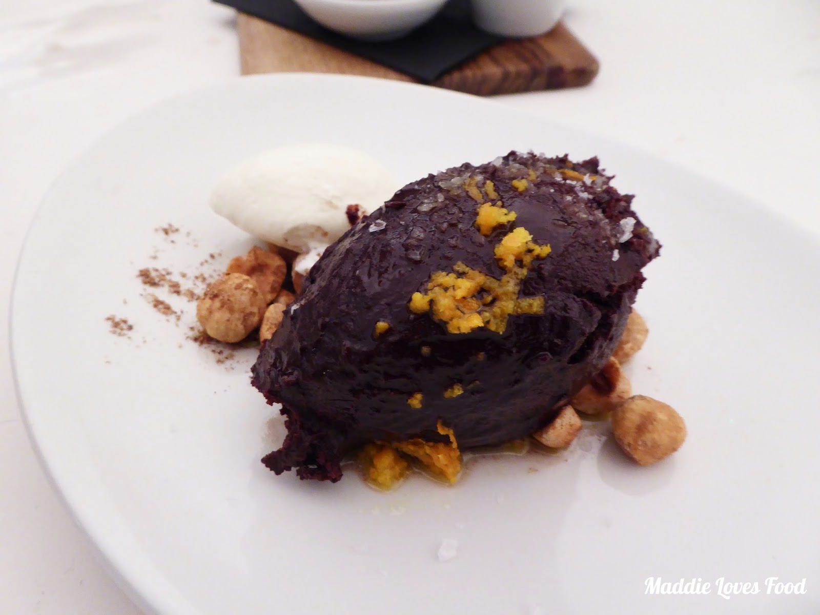 A sprinkling of sea salt brings out a jaffa-like flavour provided by the orange zest, which is echoed by a drizzle of orange oil. Spiced hazelnuts and a fluffy dollop of cream balances each bittersweet mouthful.