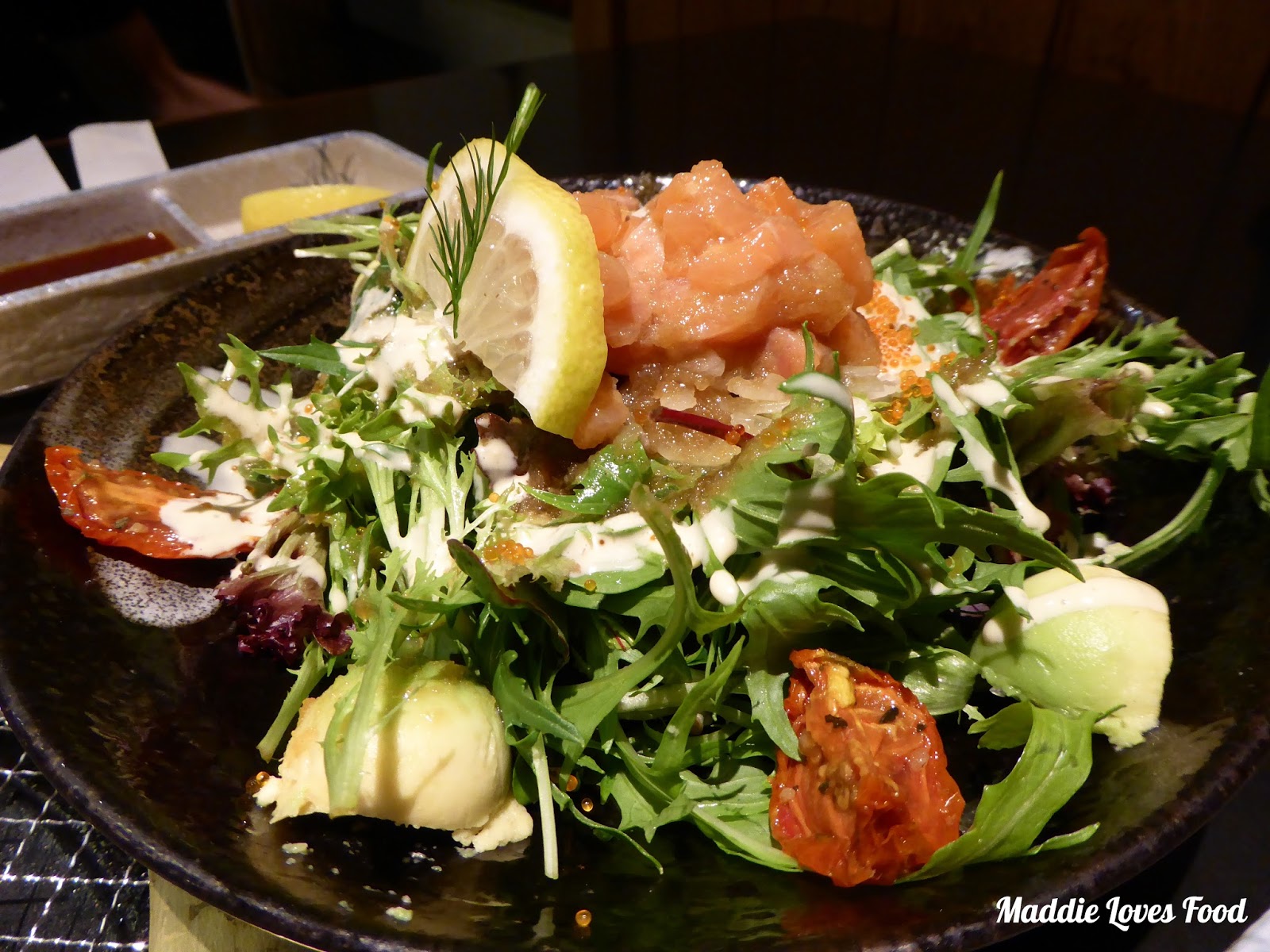 Don’t be fooled by the name, this is no ordinary salad. An injection of Japanese finesse is evident in the perfect rounds of avocado and garlicky sesame dressing. A blush-pink mound of diced salmon perches on top of bursts of sun-dried tomato.