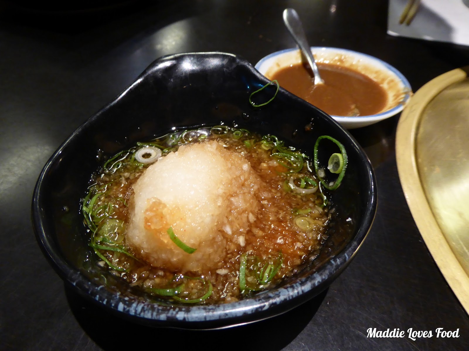 If that’s not enough, there are also a number of sauces you choose to order to dip your meat into. We go for the radish ponzu and garlic sauce, the latter of which we are told is very popular. The garlic sauce is sweet, smoky and almost caramel-like, while the radish ponzu features a mound of radish snow towering in a pool of sharp, zingy ponzu vinegar with lots of spring onion.