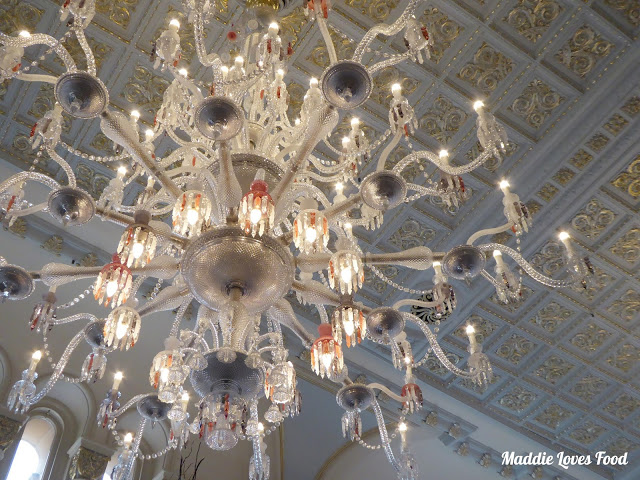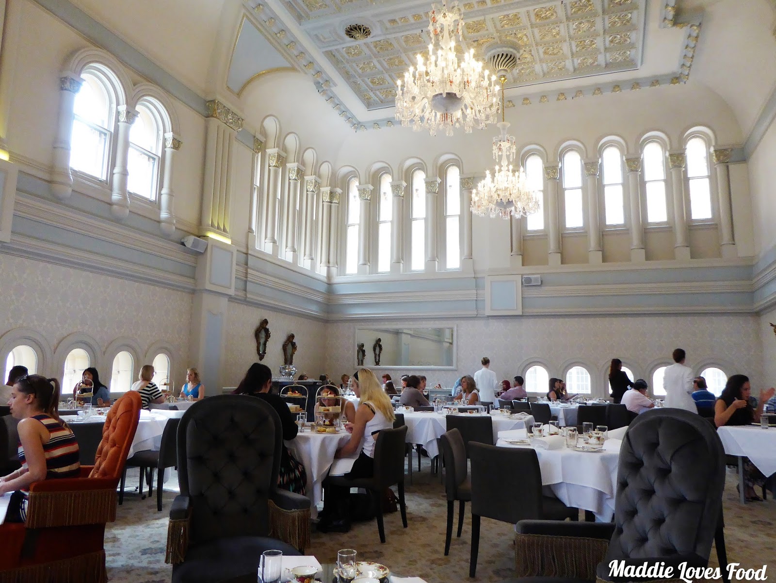 The high, gold-lined ceilings are home to glistening chandeliers, and white brocade wallpaper shares the space with powder blue trims. Each table is lined with a crisp white tablecloth, and if you’re lucky enough, you’ll score a plush, velvet lined armchair to sit in.