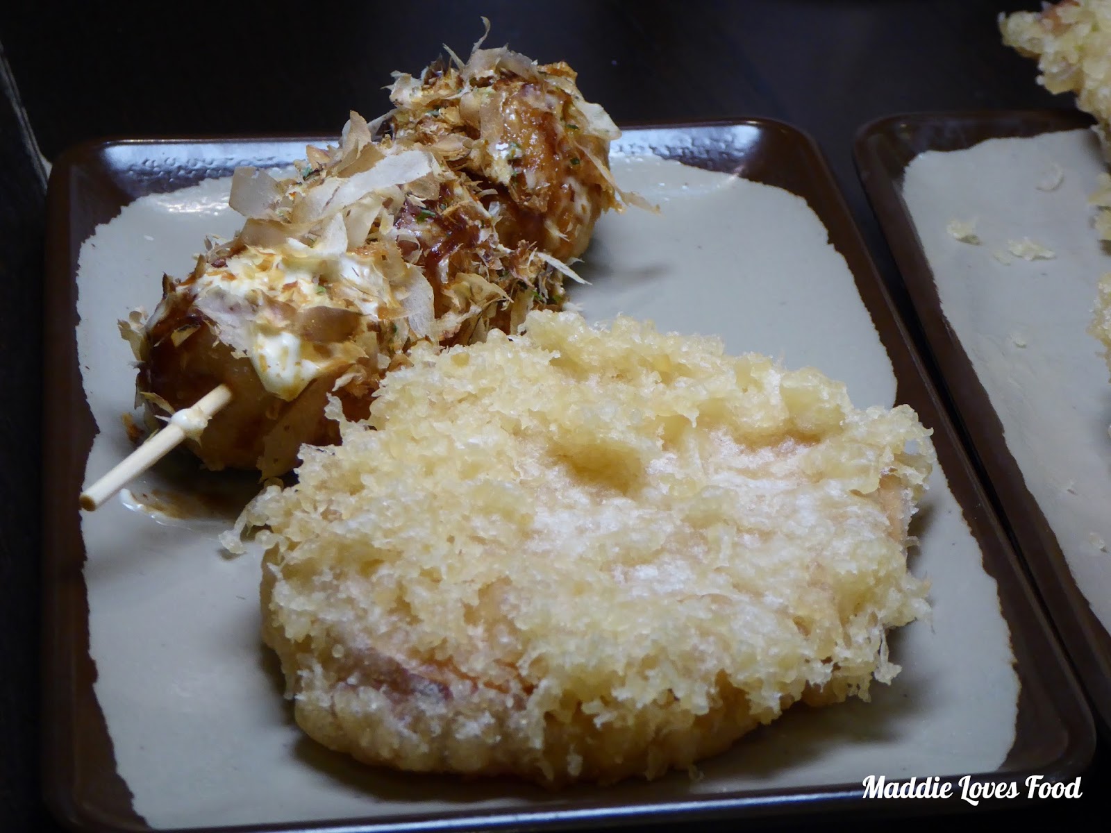 Takoyaki, chimura (fish cake), sweet potato, tempura prawn