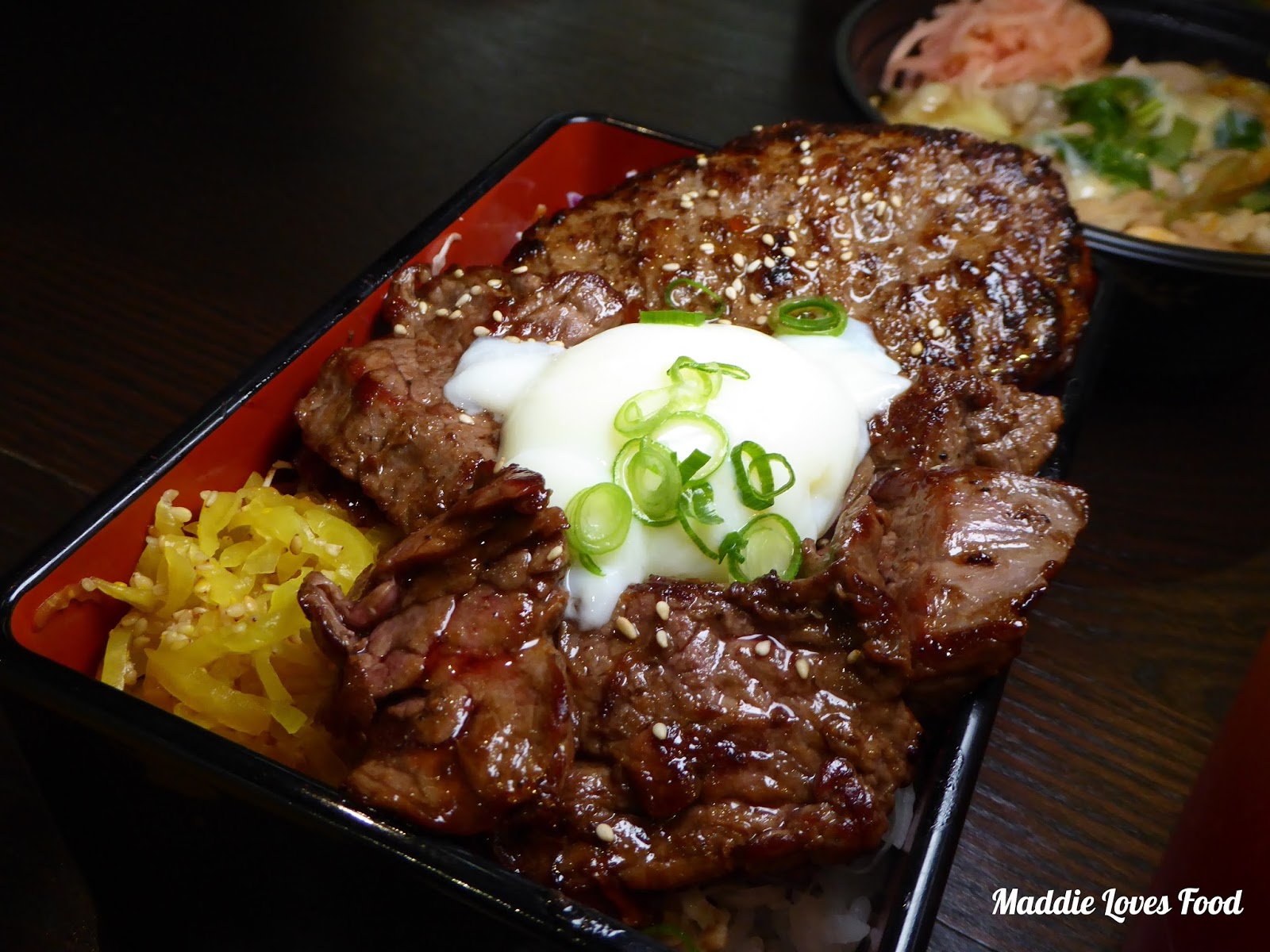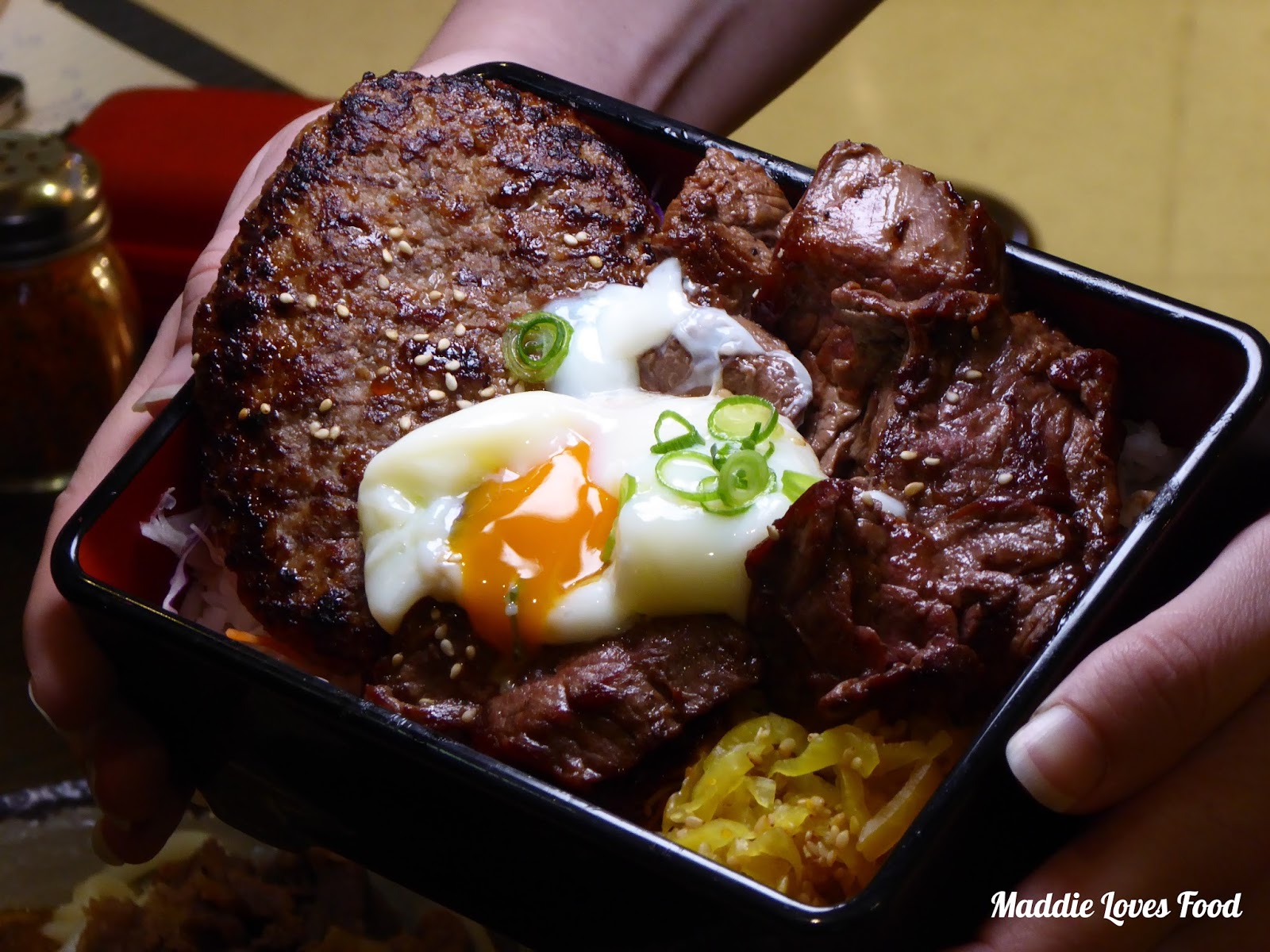 The DX Box is a meat lover’s paradise, and is made up of a grilled hamburger steak and BBQ grilled beef atop a bed of short grain rice, fluorescent yellow pickles and a token ontama. Rejoice in the pleasure of bursting the egg to let the sunny yolk spill out and form a delicious binding sauce that flavours the rice. The hamburger steak has a really nice char that lends a smoky flavour to each mouthful.